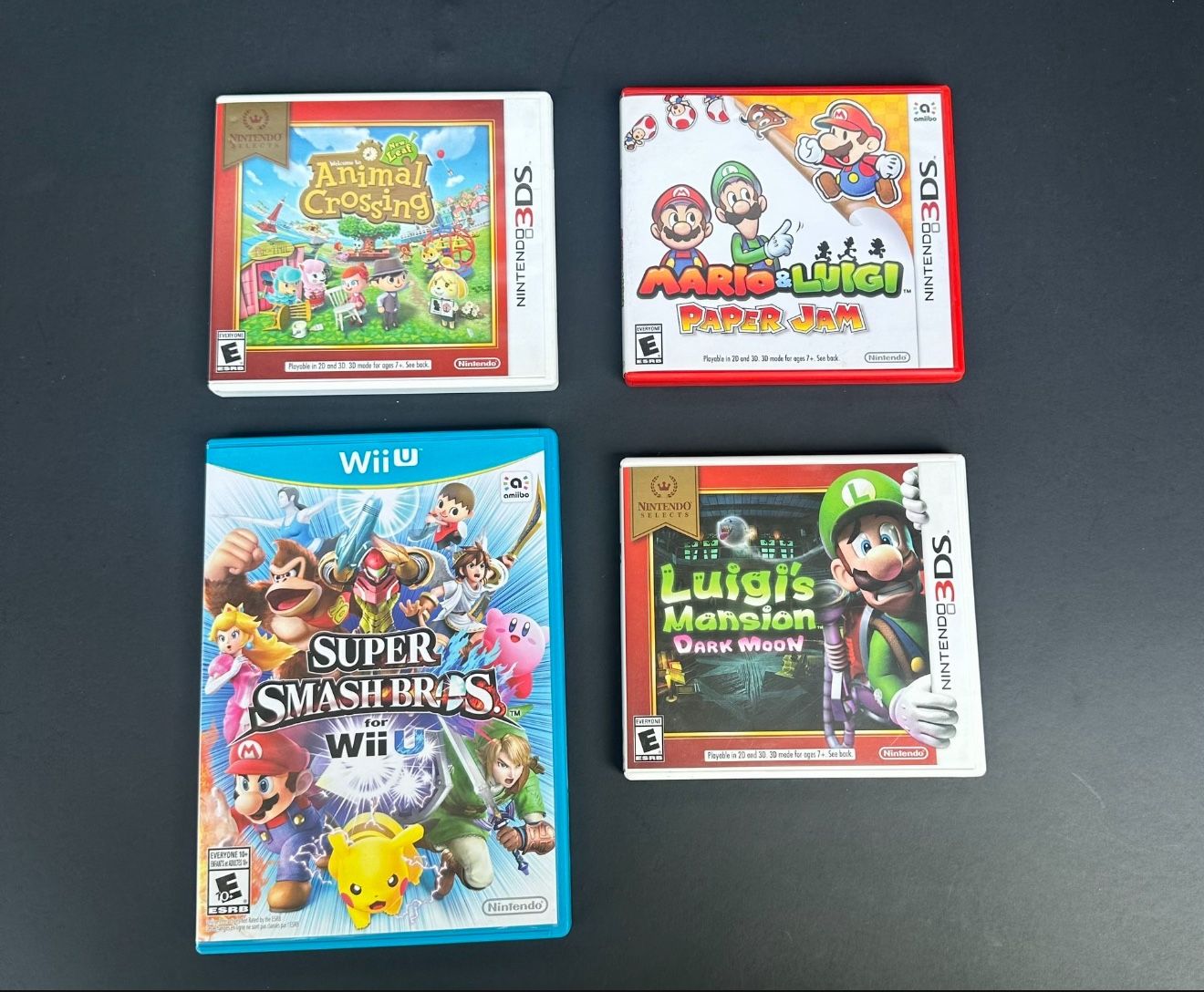 Animal crossing new leaf Nintendo select case Mario and Luigi paper jam (SOLD) Luigi’s mansion dark moon Nintendo select case Super smash bros Wii U All cases only; super smash bros also has manual $12 each or $30 for all
