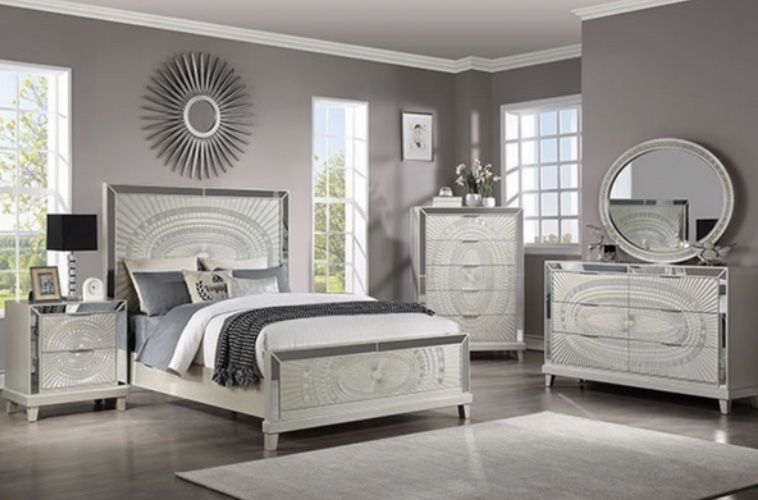 Your eyes are drawn towards this beautiful pattern of the art deco era. Mirror panels line each front edge, adding to the luxurious appeal. On top of that, the classy champagne finish exudes subtle warmth that makes this set welcoming. Item # FOA7157Q Glam Champagne Polyresin, Mirror, Solid Wood, Wood Veneer, Others 5mm Beveled Mirror USB Charger on Night Stand Hidden Jewelry Drawer in Night Stand and Dresser Decorative Pattern Dimensions: 86 1/4″L X 64 3/4″W X 63″H Some Assembly Required Mattress Sold Separate Complete The Set: FOA7157N Night Stand $329 FOA7157D Dresser $599 FOA7157M Mirror $199 FOA7157C Chest $529
