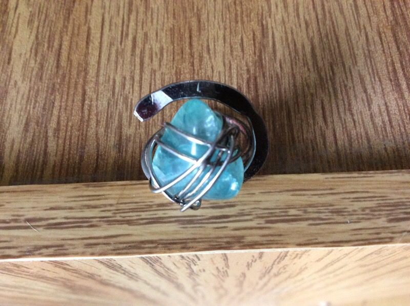 Genuine blue quartz wrapped in silver tone ring - approx size 7.5. Some discoloration on the side of the ring band which does not show when wearing.