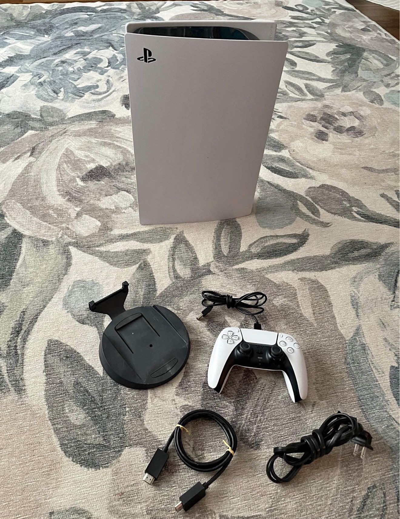 Complete PS5 disc version console. Has one white DualSense controller with cable. Comes with the stand, HDMI cable, and power cable. All essentials included. Has been reset to factory settings and is in mint condition. Used for just few months