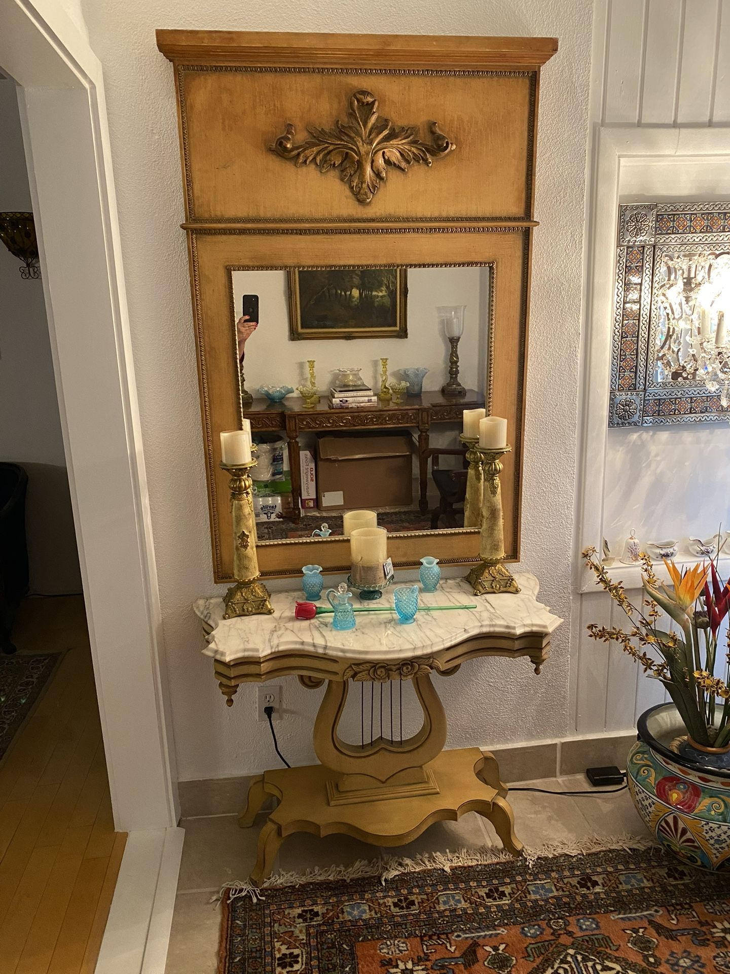 Antique Large Mirror And Wall Table With Marble Top French Provincial
