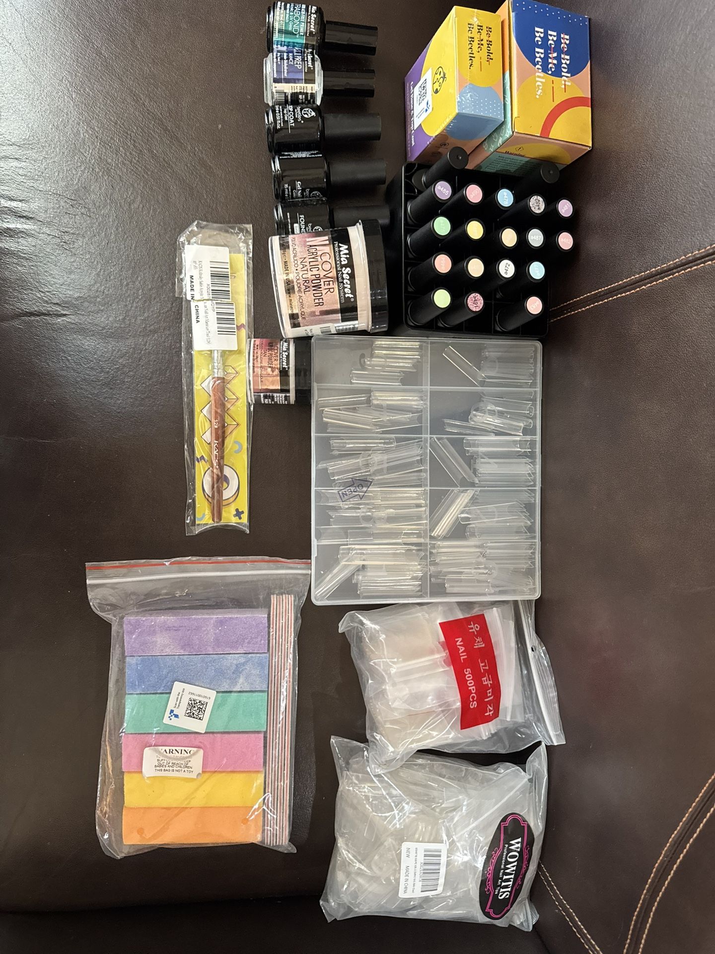 I thought I could DIY my own nails at home, but sadly I’m not talented enough. I bought everything to do acrylic nails. Some things unopened/ unused because it was in a multi pack. The bagged tips (2) have never been used. So there’s still 500 tips in each bag. I’ve used the tips in the tray 3x then I gave up. So minus about 40 tips for trial and error. I never used the buffers in the picture. It came in a pack so I only took 1 out. There’s still a lot of the acrylic powders left. (I only tried to do my nails 3x) A lot of the mini polishes have not been used because I never made it that far. (Made for design) Unopened gel base and top coat Feel free to ask any questions