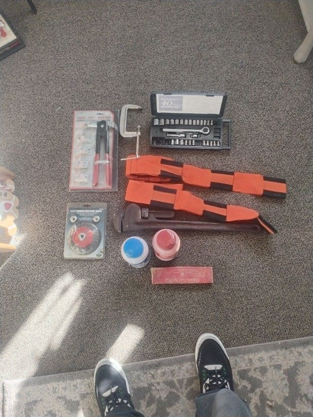 Hand nut riveter with 40 nuts, four and a half inch crimped wired bevel brush, two bottles of line chalk red and blue, a very old antique nyco press tool number 17-2, too heavy duty lifting straps, and a 40 piece socket set ratchet set, and a 4-in c clamp. I am selling them all together if you would like something singled out let me know