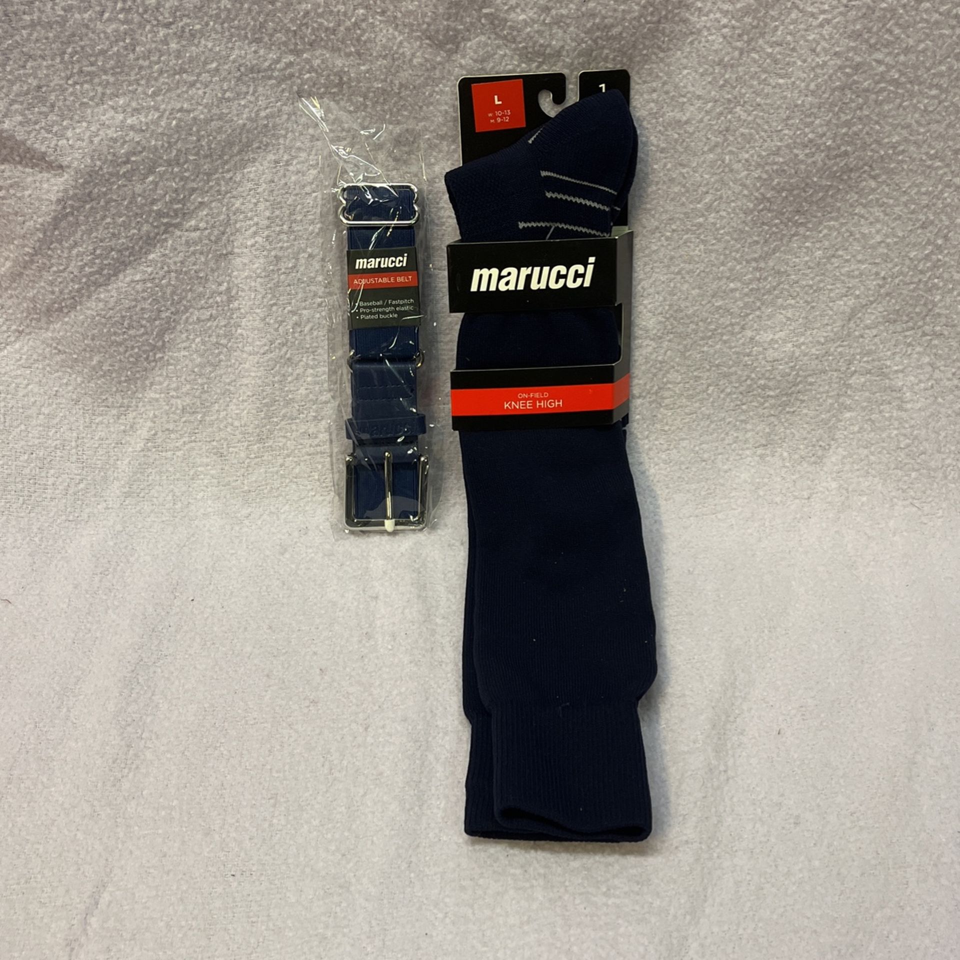 New Marucci baseball socks and belt. Original packaging and not used. Socks are size large and belt is adjustable. Navy blue for both.