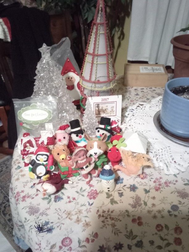 There are 2 Christmas trees that light up 5 Christmas trees that u can make them, 2 Santa Claus, 1 Christmas house, 2 snow man's, 1 teddy bear, 1 light fixture, 1 snow man that's a candle, 1 Mrs Claus, 1 Christmas picture frame, 1 Christmas dog, if you want the 2 Christmas tree separate I'll work out a deal