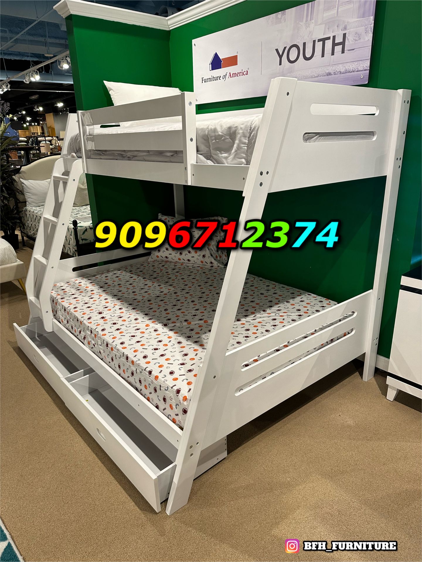 Twin/Full White Bunk bed w. Drawers & Ortho Mattresses Included