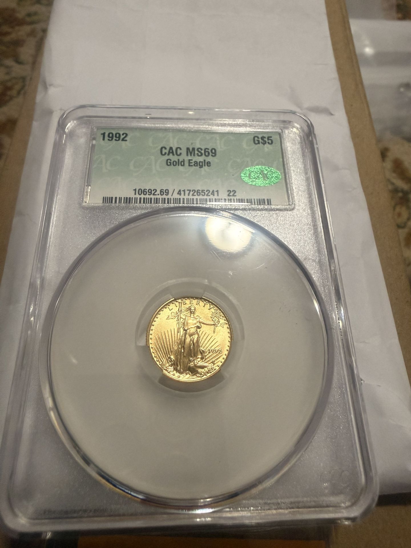 1992 $5 American Gold Eagle 1/10 Oz 0.1 Oz Gold MS69 CAC CACg *7715