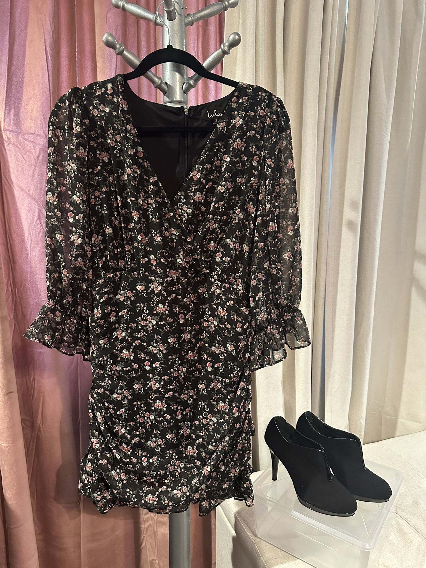 Itβs wedding season !!! π°ββοΈ π€΅ π New, never worn. Tag attached. Out of stock on Lulus! Lulus Exclusive! We are head over heels for the Lulus Estella Black Floral Print Ruched Ruffled Mini Dress! Pink, green, and beige floral print dances across sheer chiffon (atop knit lining) as it shapes a surplice bodice and plunging V-neckline. Sheer, three-quarter length sleeves are finished with elasticized, ruffled cuffs. Fitted waist sits atop a flirty mini skirt with ruching at the sides and back, finished with a cute double ruffled hem. Hidden back zipper/clasp. Touching from waist down both sides and backside creating curves galore! Details Self & Lining: 100% Polyester. Hand Wash Cold. Imported. Lined. Style 848362 ** Both heels shown are listed on my page! Also, see the Katy Perry gold sandals that look adorable with this summer perfect dress!