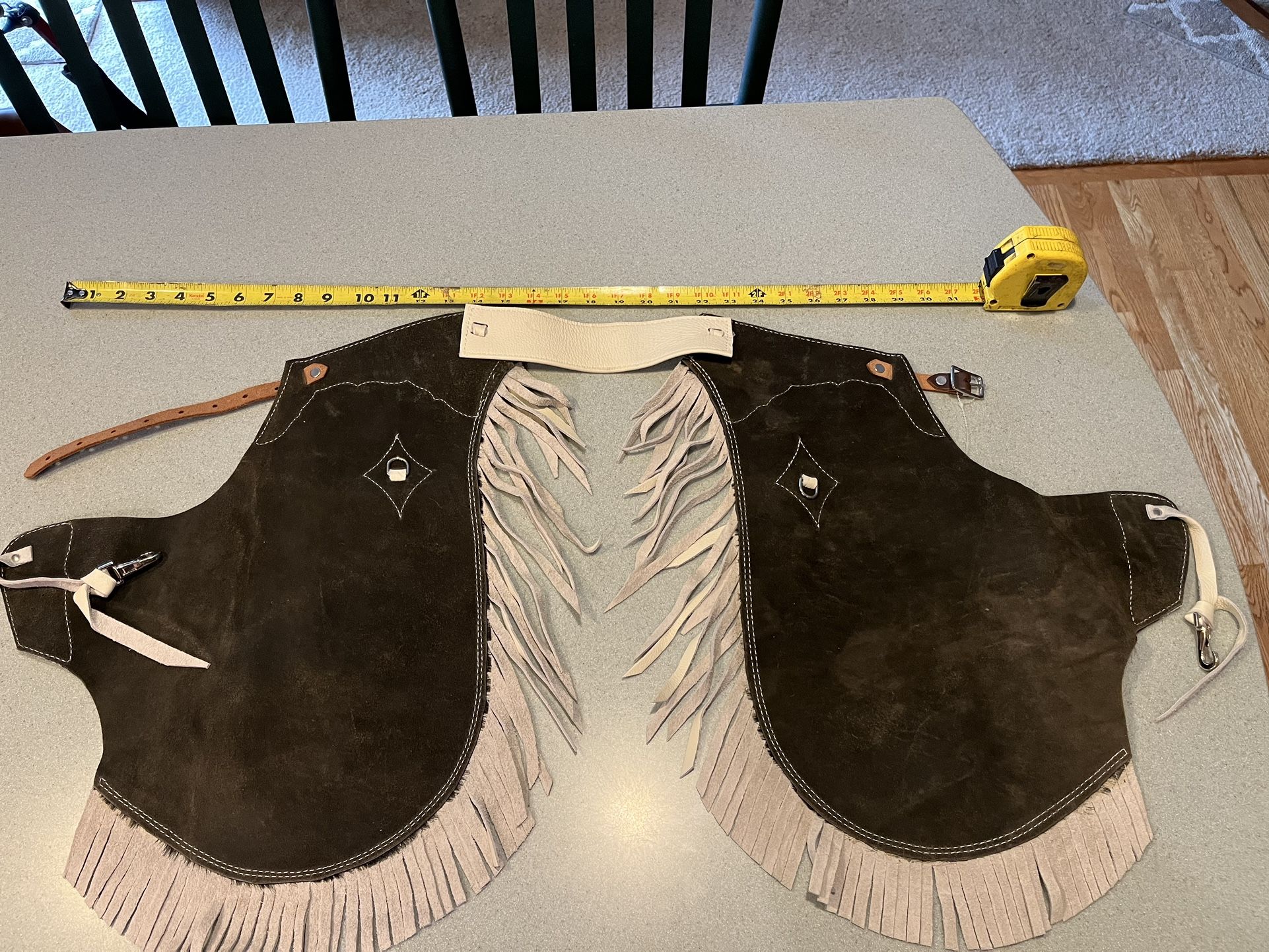 Kids custom western chaps. Black and white, hair on hide. Great for any little cowboy or cowgirl. Just in time for rodeos and 4th of July. New, bought for the grandkids to wear in 4th of July parade, then Covid hit, and no parade. They have outgrown them now. They measure approximately 31”-32” from bottom of fringe on leg to top of waist. Leg is approximately 12”-13” around at buckle. Porch pickup.