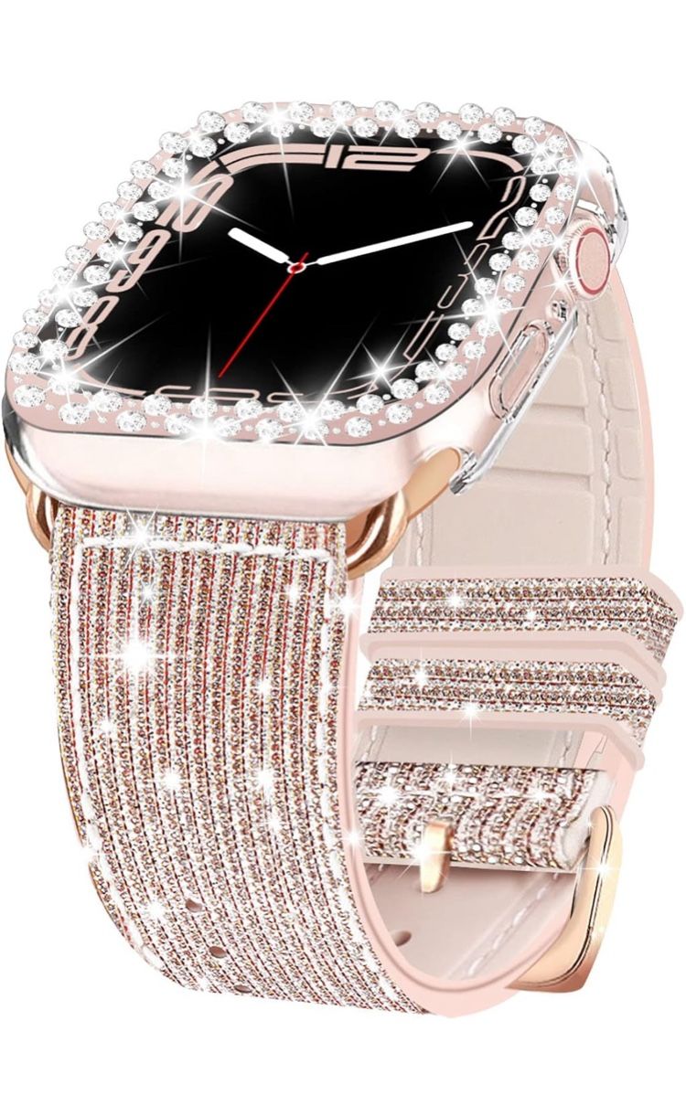 【Compatibility】Our bling silicone band compatible with Apple Watch SE /Series 8/6/5/4/3/2/1, 38mm 40mm 41mm 42mm 44mm 45mm,fit for 5.1" - 7.1"(130mm-180mm).To make sure you order the correct size, please help to check the back of your watch before you place the order. 【Good Quality】Made of soft silicone material, provides a skin-friendly and comfortable touch and free tactility for your wrists.About the glitter, you do not need to worry about it will fall off,because it is firmly buit into leather layer outside.We always provide good quality product to our customers. 【Shine Diamond Case】Come with bling rhinestone diamond PC bumper case (Not includes screen protector), protect your watch edge, keep the smart watch pretty and blingy. 【Wonderful Gift】This bling band case looks shiny which let you enjoy any popular Dress or https://offerup.com/redirect/?o=b2NjYXNpb24uSXQ= will be the best gift for Valentine’s day ,Wedding Anniversary, Thanksgiving Day, Birthday, Mother's Day, Christmas etc.