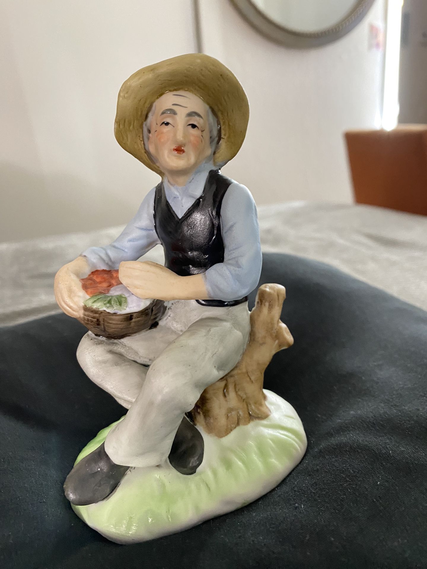 Vintage porcelain old man with bowl of cherry tomatoes sitting down to rest