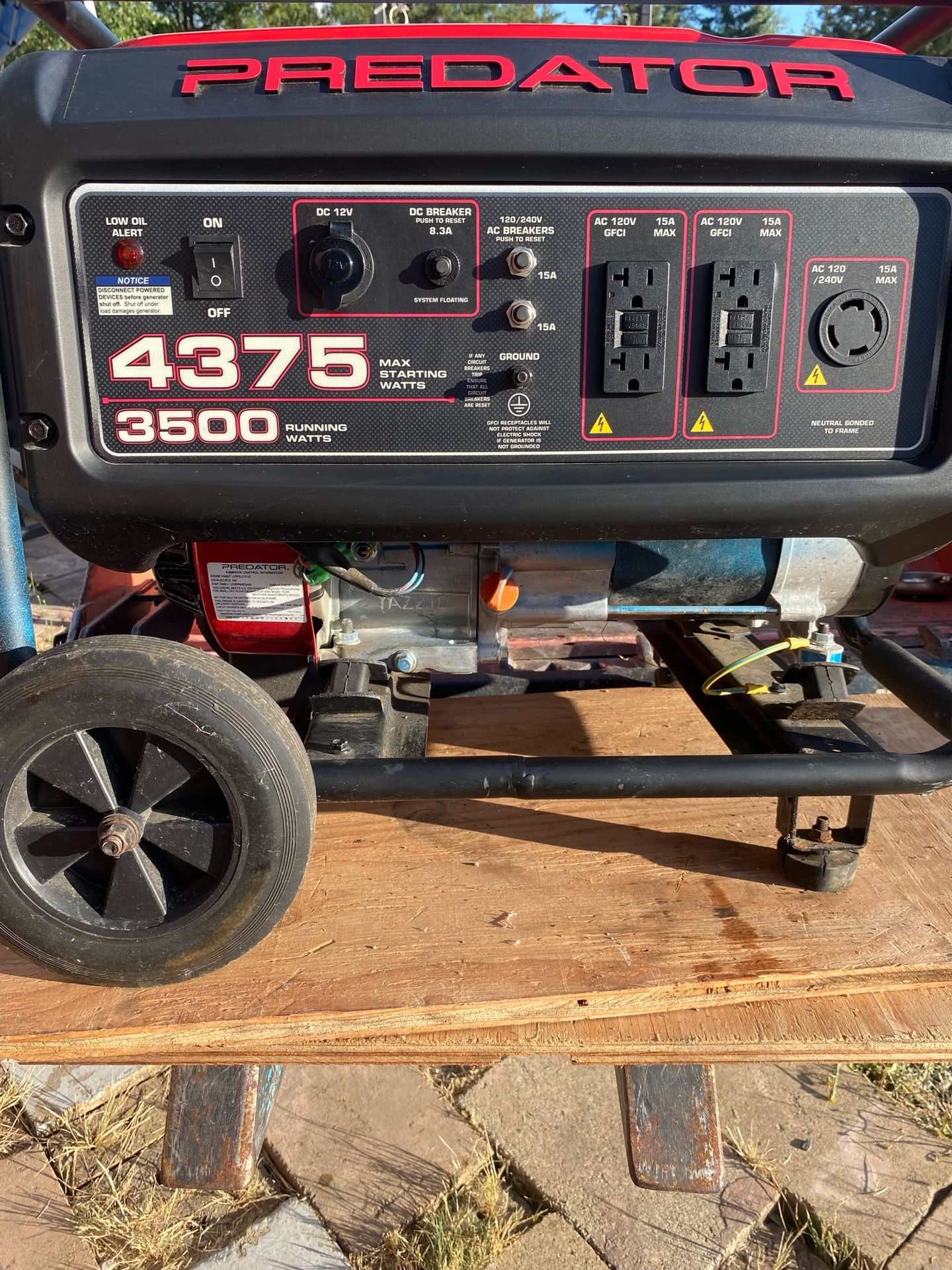PREDATOR 4375 Watt Gas-Powered Portable Generator. Great condition. Used very little. Got it to use with our travel trailer but our new RV has one built in Pick up in Eatonville near nw trek entrance. More specifically off Jensen Rd Product Overview The PREDATOR® 4375 Max Starting Watt, 3500 Running Watt Gas-Powered Portable Generator is built with reliability and safety in mind. Powered by a dependable 212cc PREDATOR® gas engine, this generator is compact, lightweight, and provides power wherever it's needed. The generator has an integrated volt meter and fuel gauge for easily monitoring output. The large gas tank provides runtimes up to 16 hours @ 50% load. CO SECURE® technology automatically shuts down the generator for safety when harmful levels of carbon monoxide are detected Powerful PREDATOR® 212cc engine easily powers RV air conditioners and other applications Runtime up to 16 hours @ 50% load Low oil indicator/low oil shutdown Circuit breaker protection prevents accidental overload Outlet covers protect against the elements and rugged working conditions Recoil start Includes (2) 120V GFCI protected 5-20R duplex outlets, (1) 120/240V L14-30R twist-lock outlet, (1) 12VDC Complies with ANSI/PGMA G(contact info removed) standard Specifications SKU(s) 59132 Brand PREDATOR Max Running Watts 3500 Output Voltage (volts) 120/240 VAC, 12 VDC Accessories Included spark plug wrench and screwdriver Application emergencies, jobsites, food trucks, and outdoor recreation Certification CARB, EPA Engine Displacement (cc) 212cc Fuel Type 87+ Octane Unleaded Gasoline Horsepower 6.5 Low Oil Shutdown Yes Product Height 19-1/4 in. Product Length 23-1/3 in. Product Weight 105 lb. Product Width 18-2/3 in. Shipping Weight 112.20 lb. Start Type Recoil Max Starting Watts 4375 Run Time 16 hours @ 50% Sound Rating (dB) 72.5 dB(A)