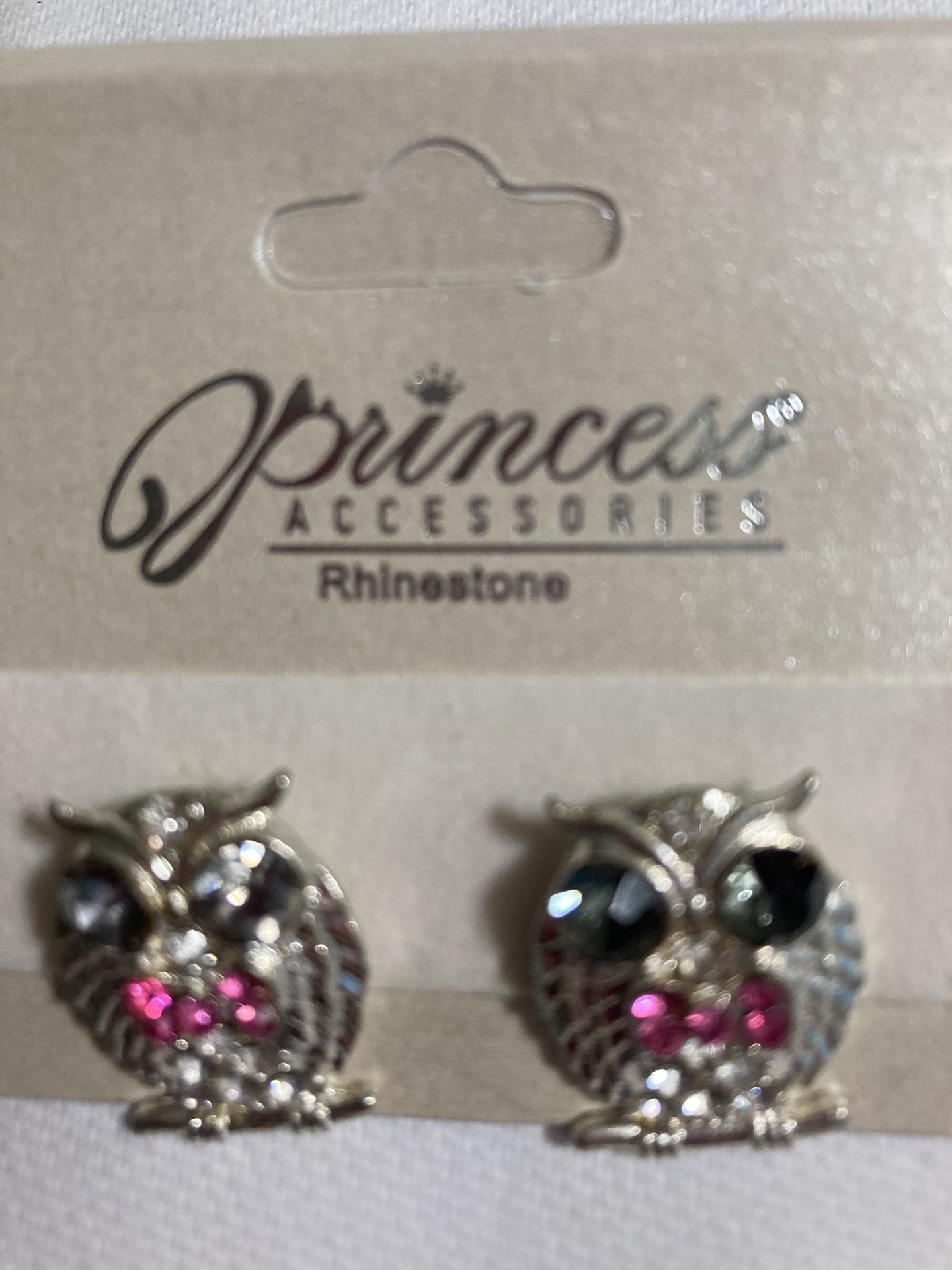 Posts pierce earrings so pretty has pink bows and black eyes clear silver like crystals owls they are also in the plastic I’ve never wore these