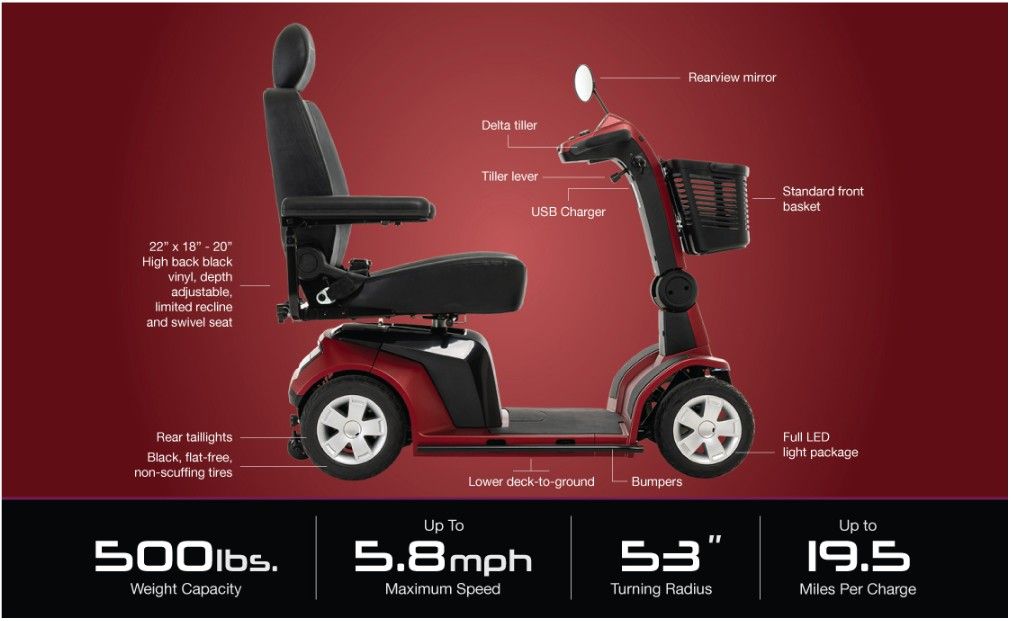 Product Highlights 600 lbs. weight capacity Up to 5.8 mph 53" turning radius Up to 19.5 miles per charge Delta tiller with ergonomic wraparound handles lets you operate the scooter with one hand Non-scuffing, flat-free tires Full LED light package include front headlights, turn signals, and rear taillights Infinite position tiller lever (mech lock) Durable and stylish side bumper are designed to reduce and prevent damage to your scooter shroud XLR battery charger on tiller 22”x18”-20” High-back black vinyl, depth adjustable, limited recline,4-point swivel seat and 7” headrest with 3” of adjustments Standard front basket User-friendly console features ambient voltmeter, horn button, light switch, on/off key switch, speed control and turn signal button USB mobile device charging port built into tiller for convenient charging of smart phones and portable electronic devices