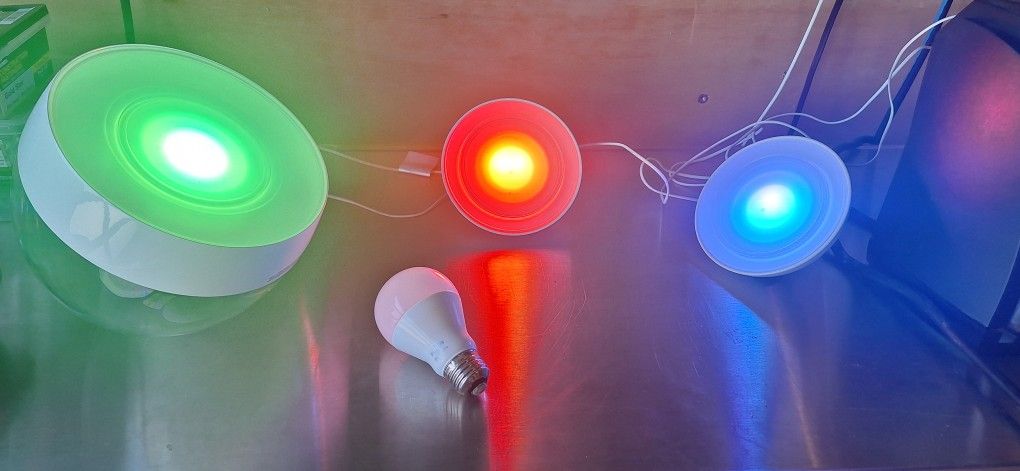 2 Bloom desktop lights 1 Iris desktop light 1 Hue White bulb