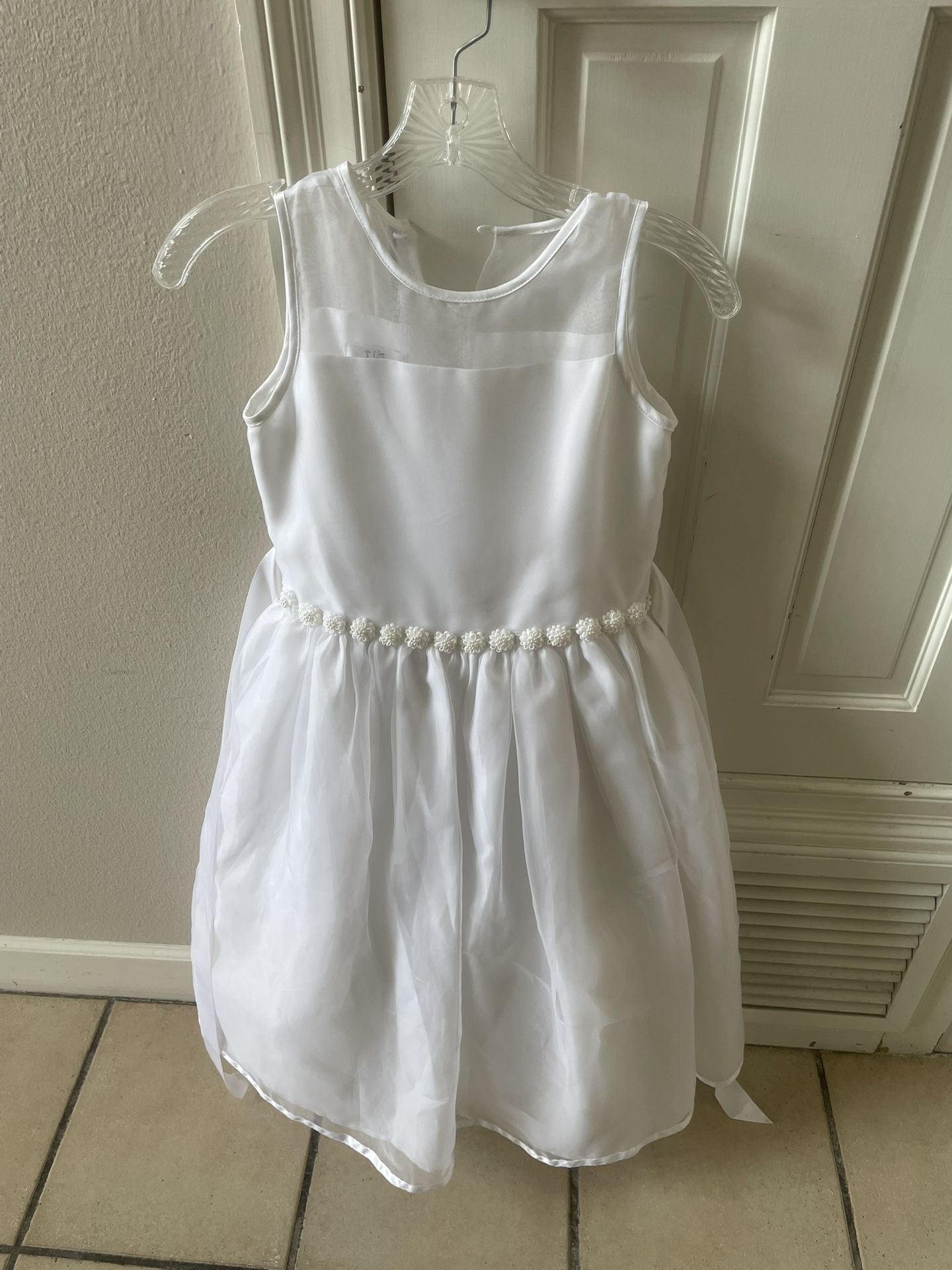 Beautiful sleeveless white satin and organza dress by US Angels, perfect for flower girl, communion, Easter, or special occasions. Features sheer overlay bodice, pearl flower belt at waist, gathered skirt, back zipper, and tie sash. Gently used, excellent condition, clean and ready to wear. Check out our other kids’ special occasion items—we offer discounts for multiple purchases!