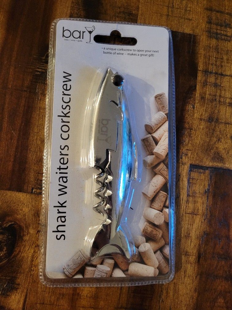 Cool, stainless steel corkscrew and foil knife in the shape of a shark. Has some good weight to it. New - sealed in package! Porch pick-up available.