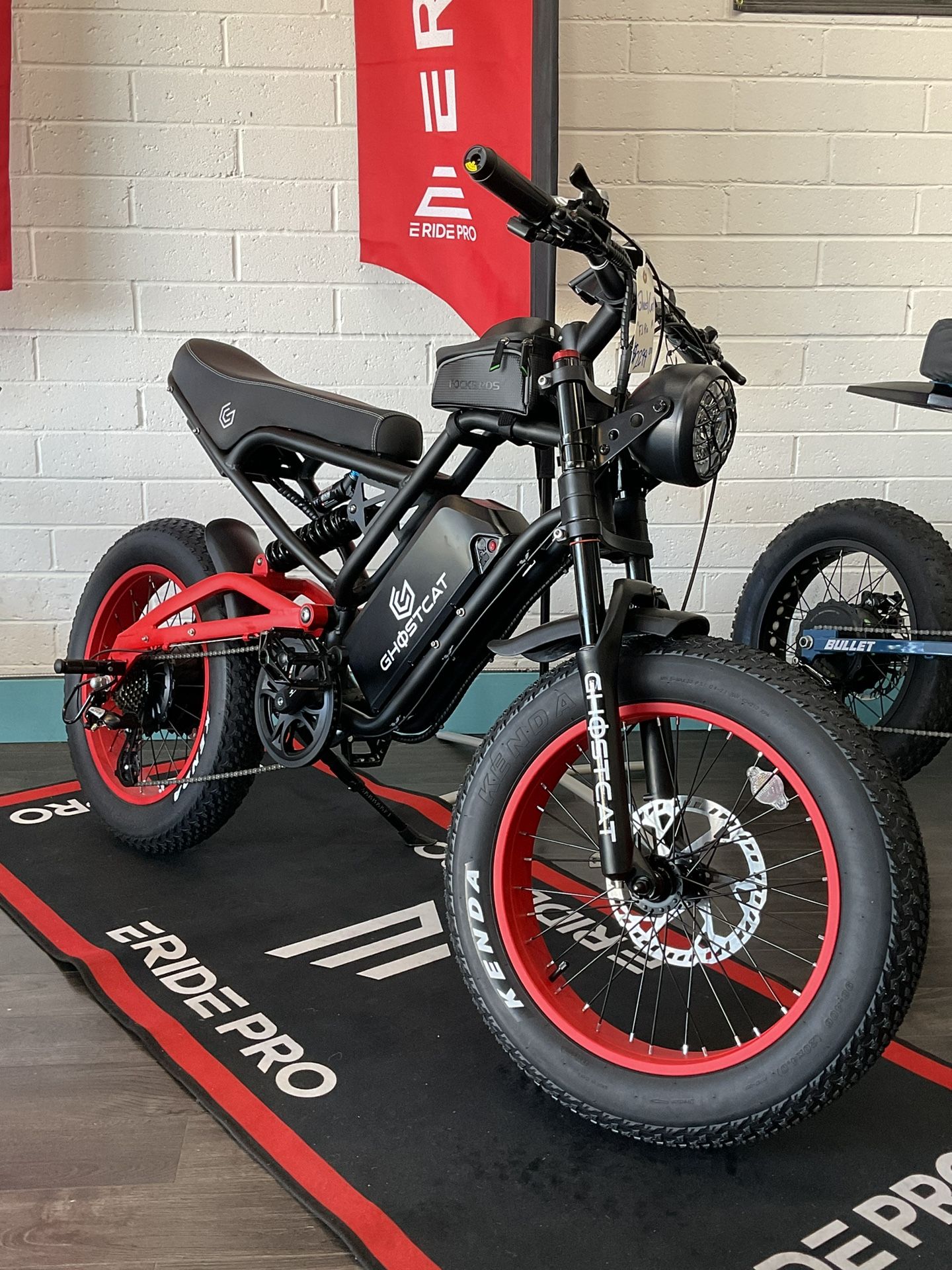 1500W Introducing the 3rd generation GHOSTCAT all-terrain fat tire electric bike specifically engineered to maneuver as a high-performance lightweight motorcycle inspired Dual Sport bike. GHOSTCAT was carefully designed by selecting premium specifications to ensure a best-in-class riding experience for on-road and off-road adventures. The lightweight aluminum alloy soft tail frame with adjustable front hydraulic and rear adjustable suspension provides the ultimate shock absorbing system to ensure you have a smooth ride across all terrains. This bike is powered by a high powered 52v1500W nominal motor with 140NM+ torque. The bike is delivered programmed to 20 mph max speed and the motor is limited to 750W continuous power per class 2 e-bike requirements. The bike can be