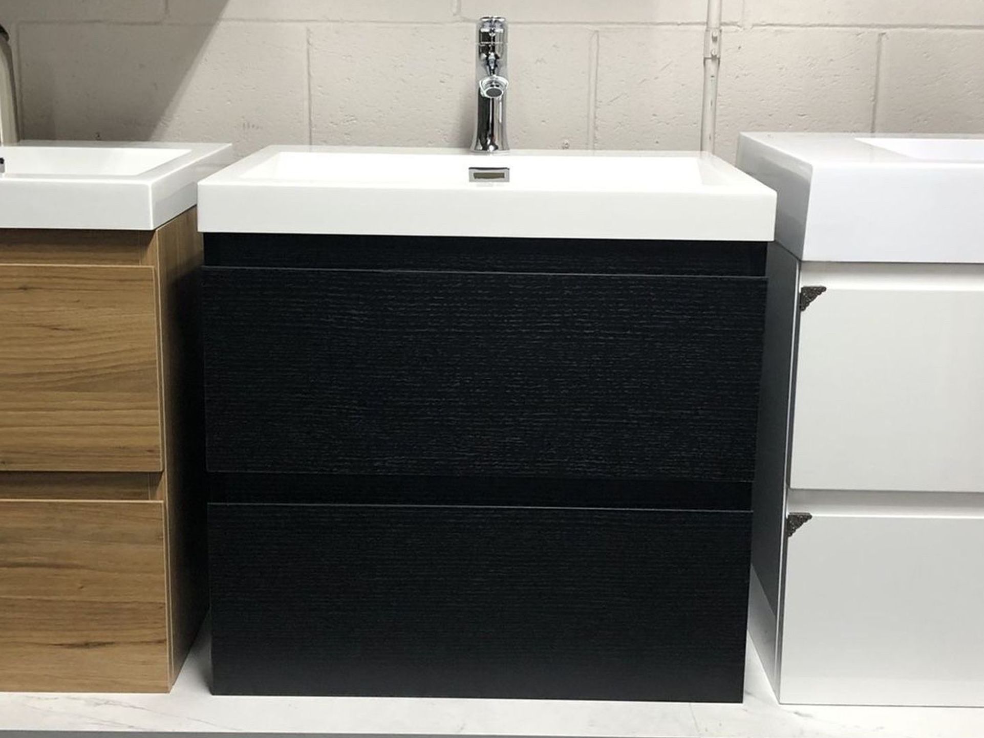 24”-30” units in stock start at $450 includes soft close cabinet, hardware, top/sink. With mirror, faucet and pop up $550 Toilets are soft close, one piece, modern, dual flush. Includes seat/lid and install kit. $295