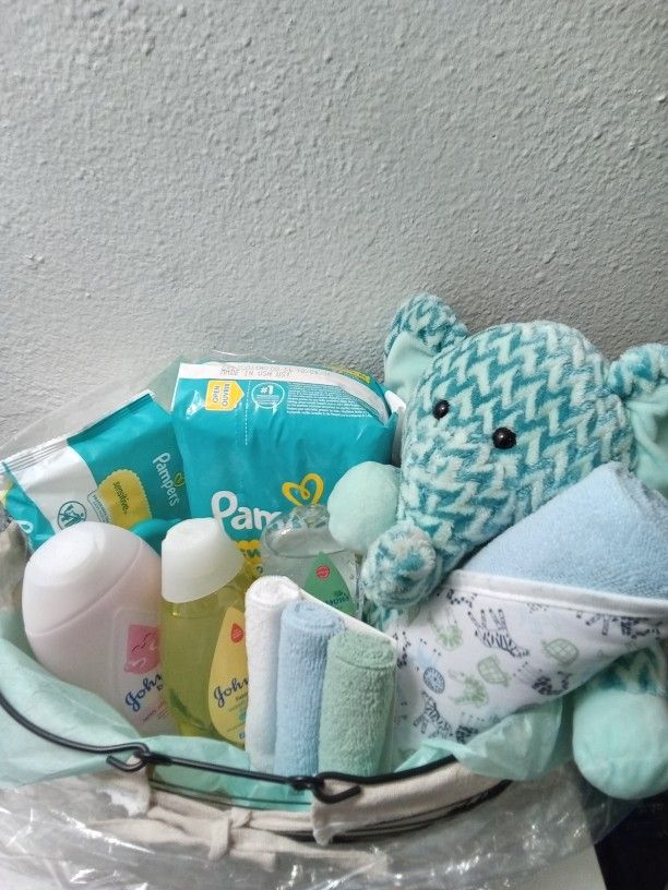 Stuffed elephant Plush Pack of sensitive wipes 56 count Pampers Swaddlers Newborn Size P1 27 count Baby lotion Baby wash&shampoo Baby gel 1 Baby towel 3 small Washcloths BASKET WILL BE PROPERLY WRAPPED&BOW WILL BE ADDED WHEN PURCHASED