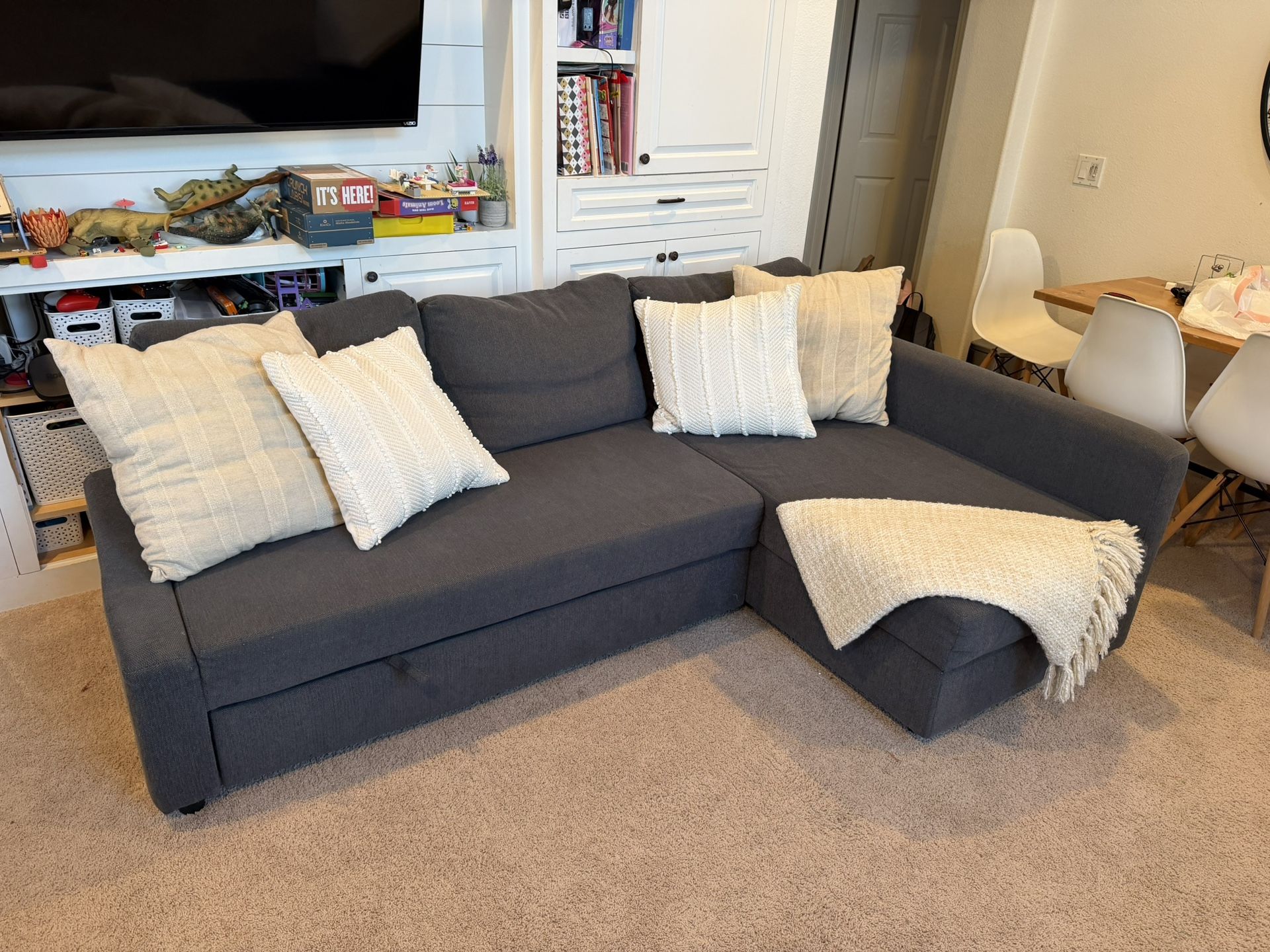 This sofa converts quickly and easily into a spacious bed when you remove the back cushions and pull out the underframe. Sofa, chaise and double bed in one. Storage space under the chaise. The lid stays open so you can safely and easily take things in and out. You can place the chaise section to the left or right of the sofa, and switch whenever you like. 92W x 35D 31W x 59D chaise lounge part Storage is under the entire chaise No pets Turns into a queen size bed. https://offerup.com/redirect/?o=aHR0cHM6Ly93d3cuaWtlYS5jb20vdXMvZW4vcC9mcmloZXRlbi1zbGVlcGVyLXNlY3Rpb25hbC0zLXNlYXQtdy1zdG9yYWdlLXNraWZ0ZWJvLWRhcmstZ3JheS1zNjkyMTY3NTcv