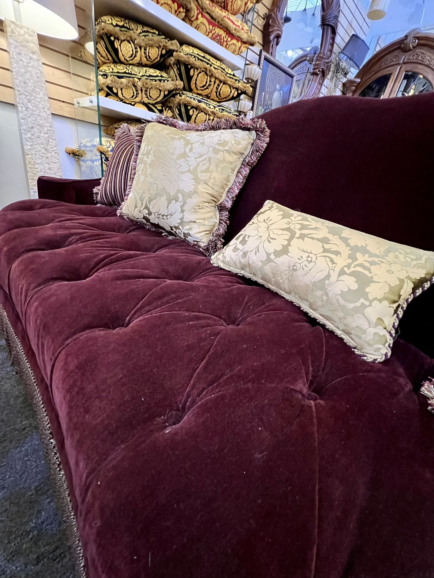 WE HAVE A LARGE INVENTORY IN HIGHEND FURNITURE, WOOD FURNITURE WITH ALL DIFFERENT COLLECTIONS. DINING ROOM SETS, BEDROOM SETS, LIVING ROOM SETS AND MANY OTHER BRANDS LIKE MAITLAND SMITH, VERSACE, BERNHARDT, HENREDON, BENNETTI AND ALSO ITEMS TO COMPLEMENT YOUR HOME DECOR, ACCESSORIES, PERFUM, JEWELRY, CHANDELIERS AND MORE. ASK FOR A VIDEO CALL WITH US!!! FREE DELIVERY UP TOP 20 MILES!!! Was Before: $1895 NOW: $1695 Russian palaces and the romance of destinations like Versailles are the inspiration behind the Imperial Court collection by Michael Amini, crafted with walnut and rosewood veneers and dressed in a Radiant Chestnut finish. Magnificent marquetry, brass metal accents, and red, gold and champagne fabrics throughout the collection add a distinctive royal touch. Includes: 1 x Tufted Sofa - Eggplant 4 x 20" Square Pillows 1 x 12"x20" Rectangle Pillow Dimensions: Tufted Sofa - 89"L x 39"D x 40"H AICO Furniture designed by Michael Amini has been a TOP name brand since 1988 AICO, which stands for Amini Innovation Corp, features original furniture designs and is known for high quality and intricately designed home furnishing case goods and upholstery. They offer many collections that suit various tastes and styles. Ask for our FINANCE LAYAWAY program!!! 🦊 Additional we have Available FINANCING with Klarna, PayPal, ACIMA And more!!! Available at: Snooty Fox Consignments 840 E Oakland Park Blvd Oakland Park, FL 33334 754.206.20.77