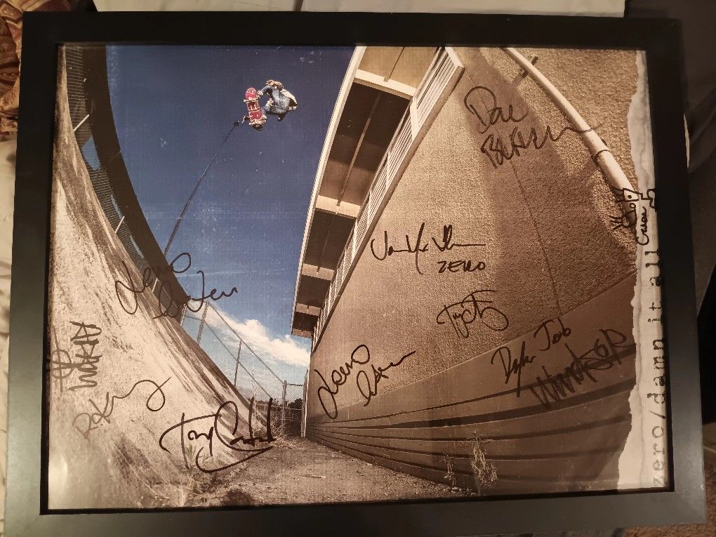 This was signed by Jamie Thomas and the entire zero skateboard crew when they were here a few years back. Framed and in fantastic shape