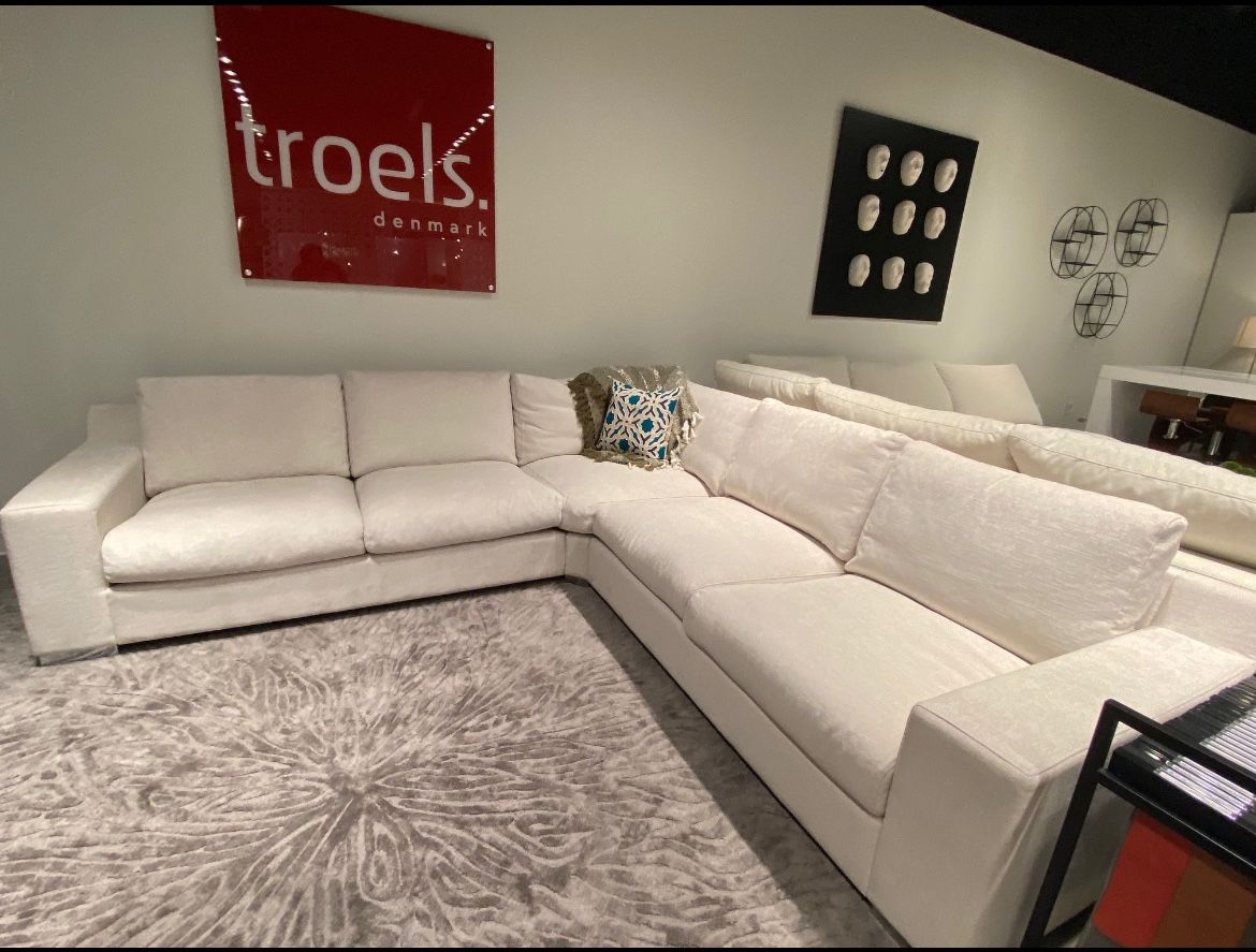 NEW sectional Nature fabric with chrome legs Premium Materials Down back pillows and down wrapped seat cushions Super Comfortable Size: 110.75” x 110.75” Made in Europe We have 5 left MSRP; $6,054.00 !! Cash only You pick up or we help arrange delivery with a local company. Warehouse will be open this Saturday from 11am to 4pm