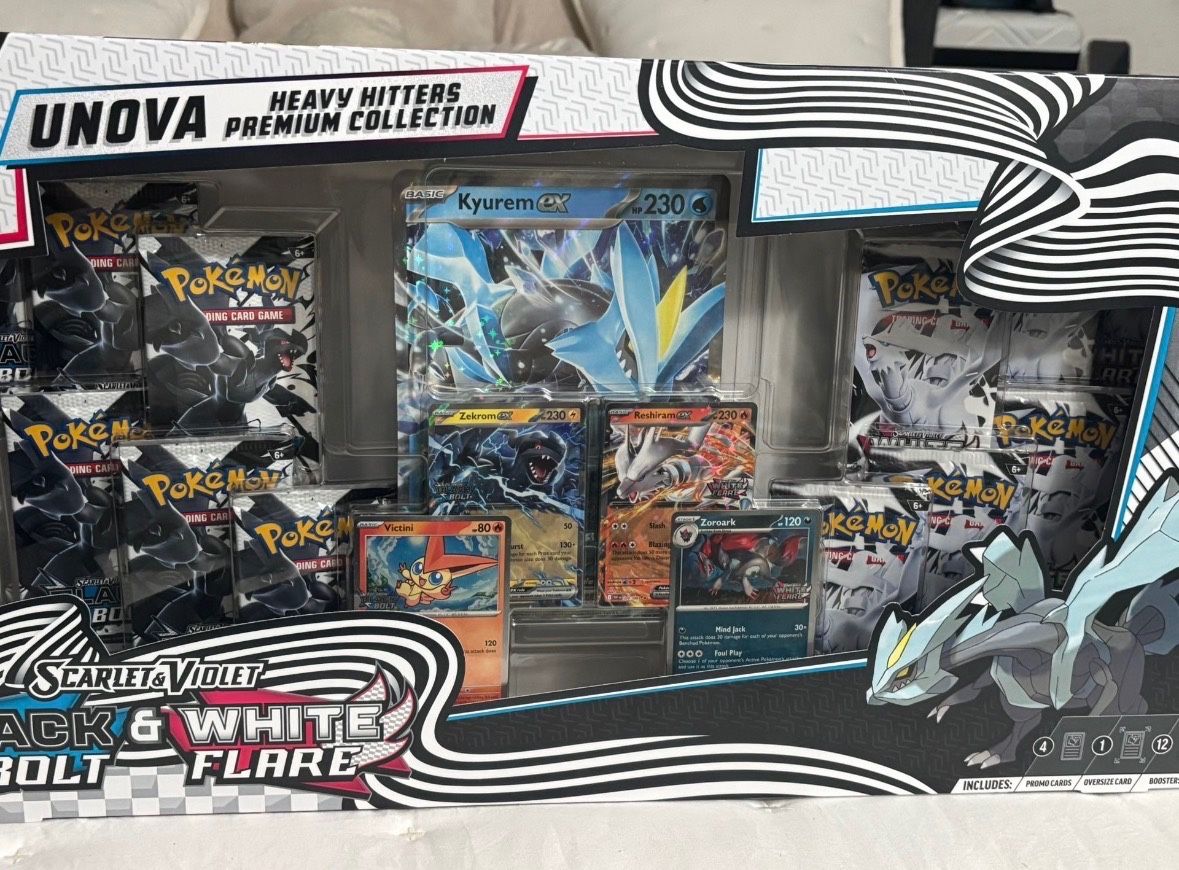 Pickup in West Covina foil promo cards featuring Zekrom ex and Reshiram ex • 2 foil promo cards featuring Victini and Zoroark • 1 oversize foil promo card featuring Kyurem ex • 6 Pokémon TCG: Scarlet & Violet-Black Bolt booster packs • 6 Pokémon TCG: Scarlet & Violet-White Flare booster packs