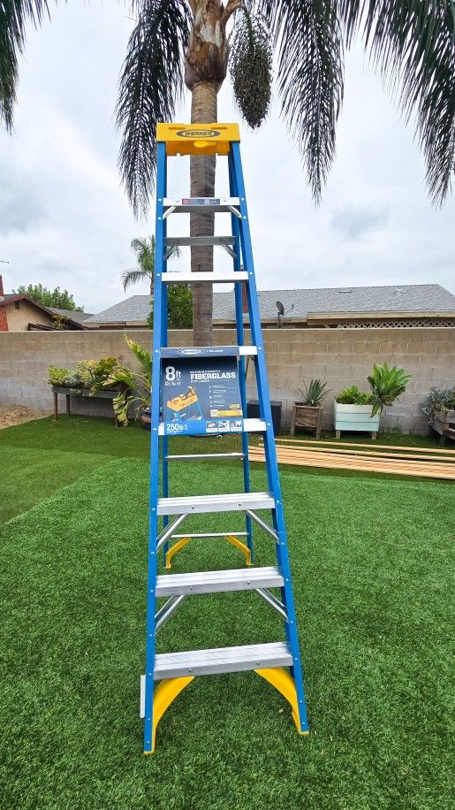 Item is New firm on price. The Werner ladder is designed for pro-grade stability and comfort, featuring 30% larger standing surface at the most common working height to reduce foot fatigue. Extra-large feet offer 50% more gripping surface for added confidence when climbing. This versatile, lightweight ladder is Type I 250-pound load capacity and is ANSI and OSHA compliant. Maximum strength, non-conductive fiberglass with reinforced edge bracing delivers strength and durability. External Pinch-proof spreaders open and close easily. ladder top holds up to 12 tools, including an impact driver, for enhanced productivity—keeping the most common items within reach for fewer trips up and down the ladder. Lock-in accessory compatible for expanded organization—easily add a paint cup, job bucket, or job caddy to hold extra materials and small parts. Dimensions Base Spread (in.): 53.5 in Industry Standard Ladder Height (ft.): 8 Reach Height (ft.): 12 Rung/Step Depth (in.): 3.125 in Step Ladder Maximum Height - Closed (ft.): 8 Step Ladder Minimum Height - Open (ft.) 16 Step Rise (in.): 12 Storage Depth (in.): 6 Details Features: Folding Ladder Product Type Standard: A Frame Ladder Rating Type 1 - 250 lbs. Ladder Type: Step Ladder Load Capacity (lb.): 250 lb. Material: Fiberglass Number of Steps: 8 Product Weight (lb.): 25 lb Step Material: Aluminum Certifications : ANSI Certified, OSHA Certified