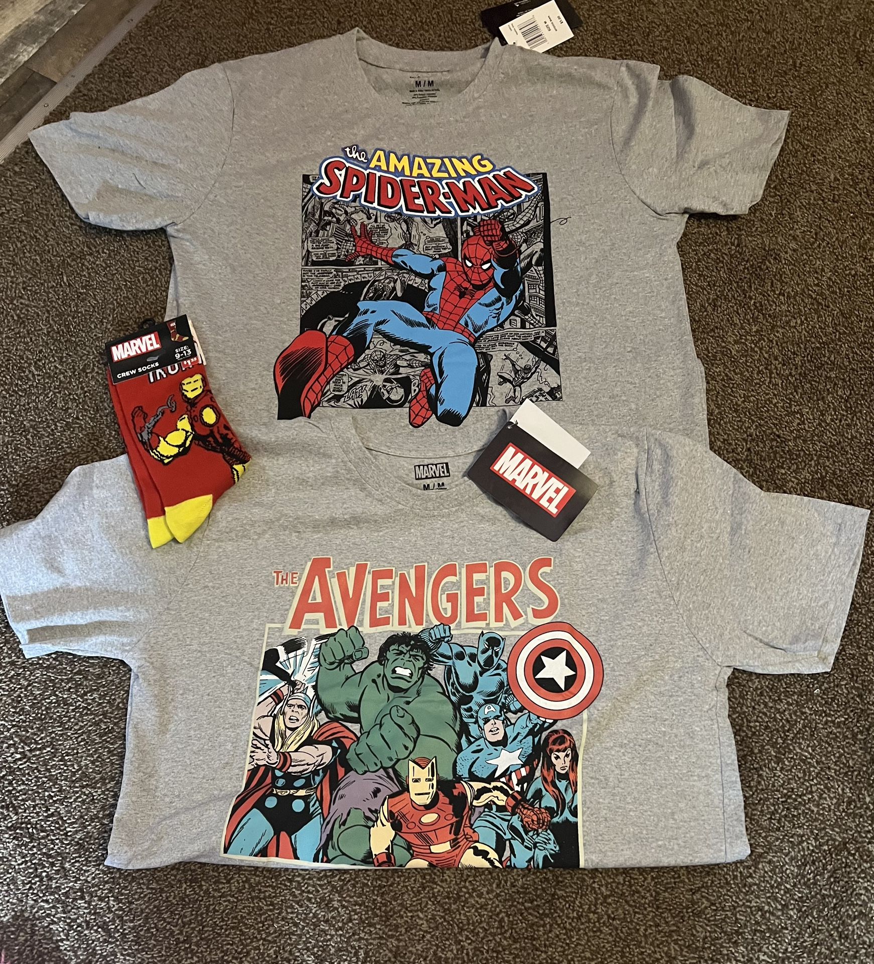 Brand New Marvel T- Shirts with Tags. Also included is a MARVEL pair of crew socks. Size Medium. MARVEL & SPIDERMAN Shirts $10.00 Local Pick up - Gull Road Area or West Main Area. Shipping- will ship the day the item sells or the next day. #itsthelittlethings