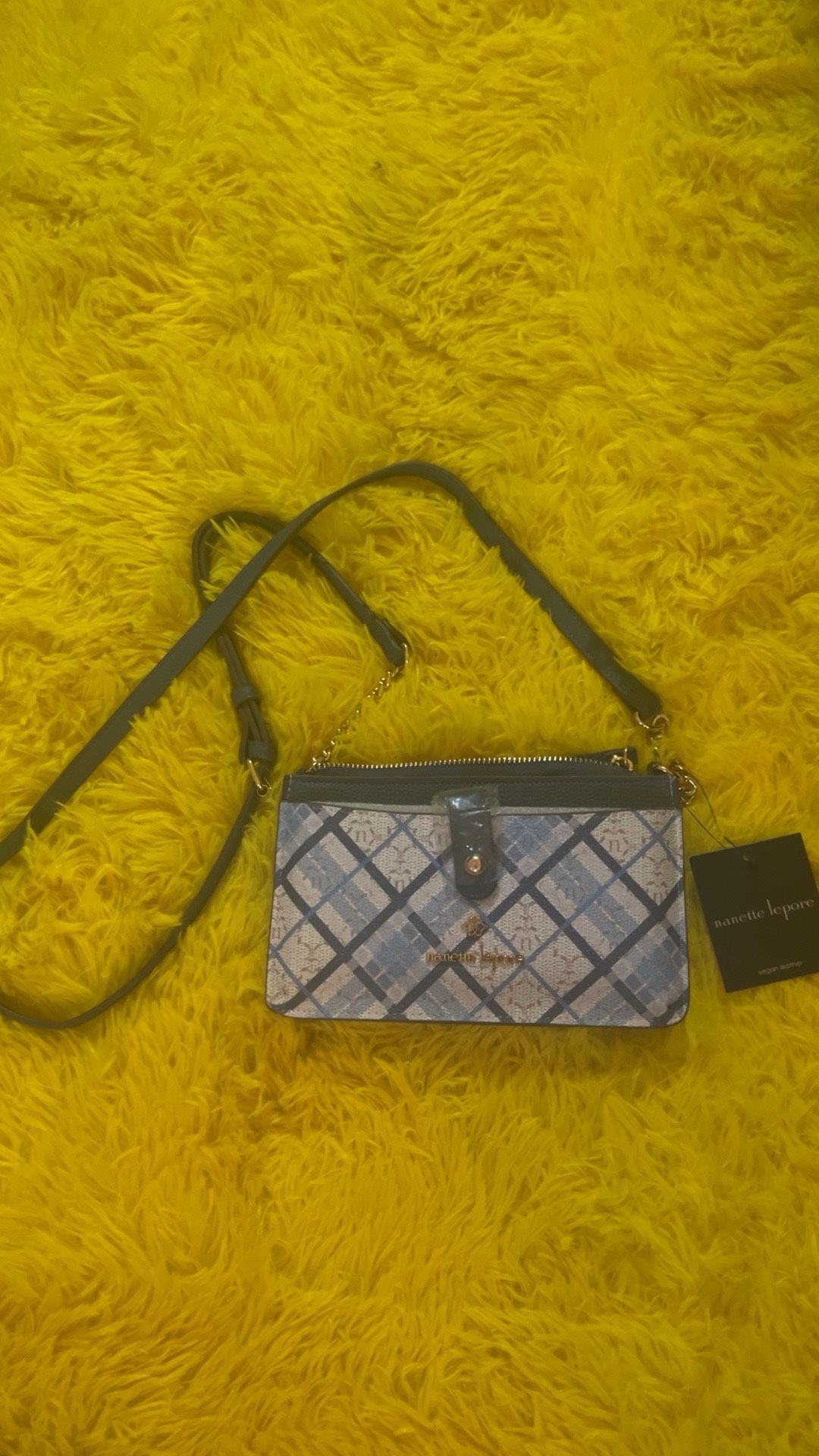 Blue and white, pin-stripe crossbody or hand clutch, designer purse by Nanette Lapore. It has its own unique personality. Reminds me of teen spirit or valley girl! :) it’s very versatile and i forgot to mention… it’s brand new!! Tags and all!