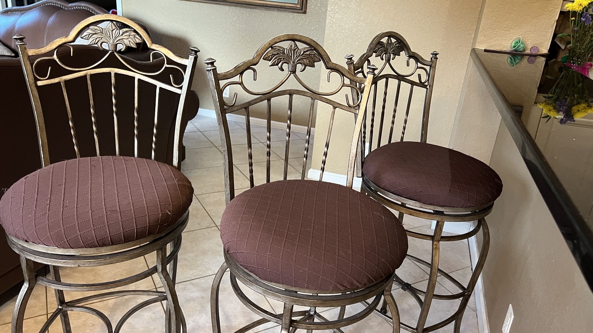 *****3 BAR STOOLS Set of 3 Bar Stools** – Metal frames with cushioned maroon seats and decorative backs. Perfect for kitchen islands or bars. Excellent condition. dinning table 4 chairs good condition no scratches on the glass Pickup only.