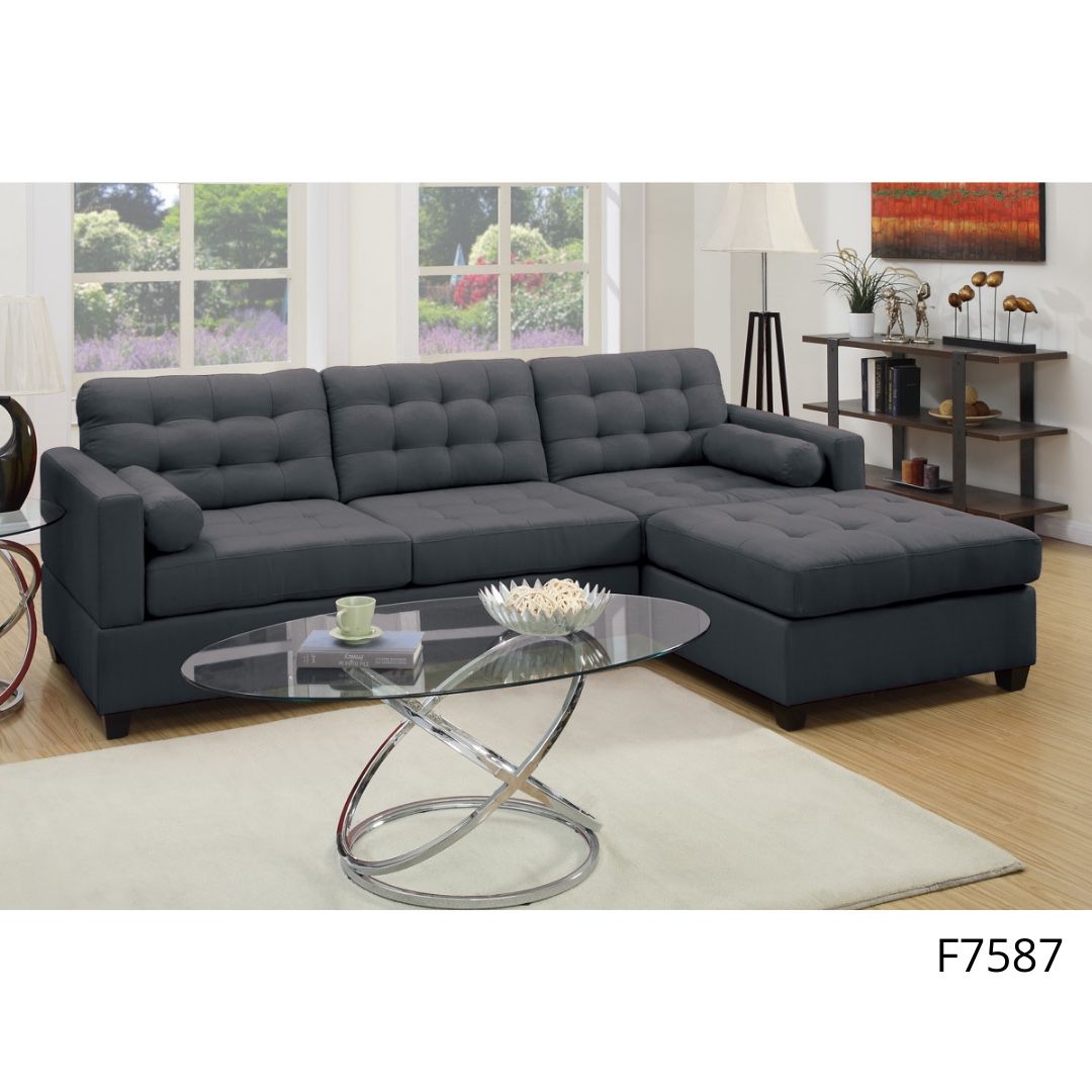 Sectional Sofa Item # F7587 Color: Slate Black Polyfiber Solid pine Plywood Dimensions: Sectional : 110″ x 72″ Reverisble L/R Chaise: 66″ x 36″ x 35″H 2-Seat Sofa: 66″ x 36″ x 35″H Some Assembly Required