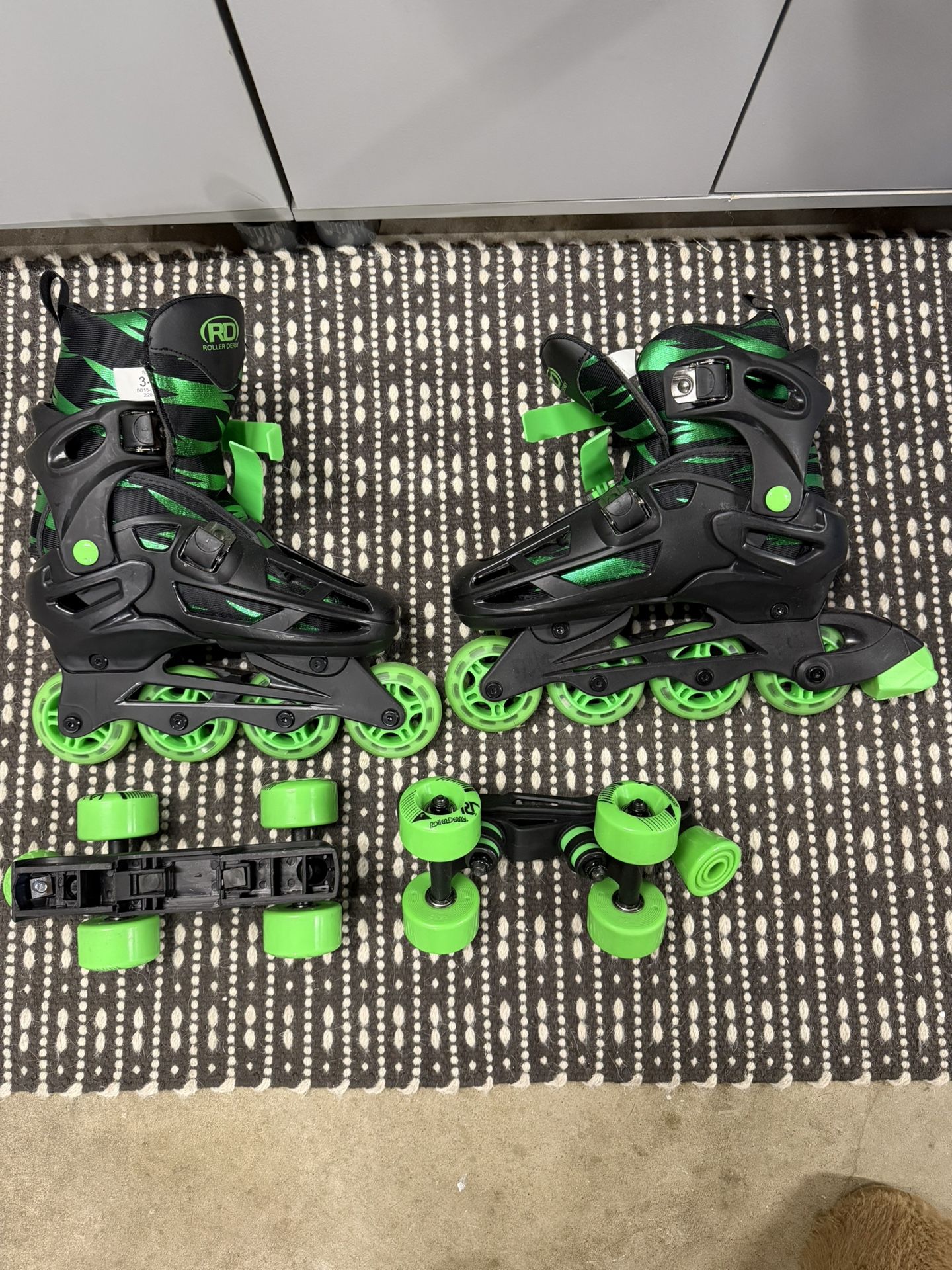 Size 3-6 Never worn, I bought the wrong size for my son. Switchable to skates and roller blades