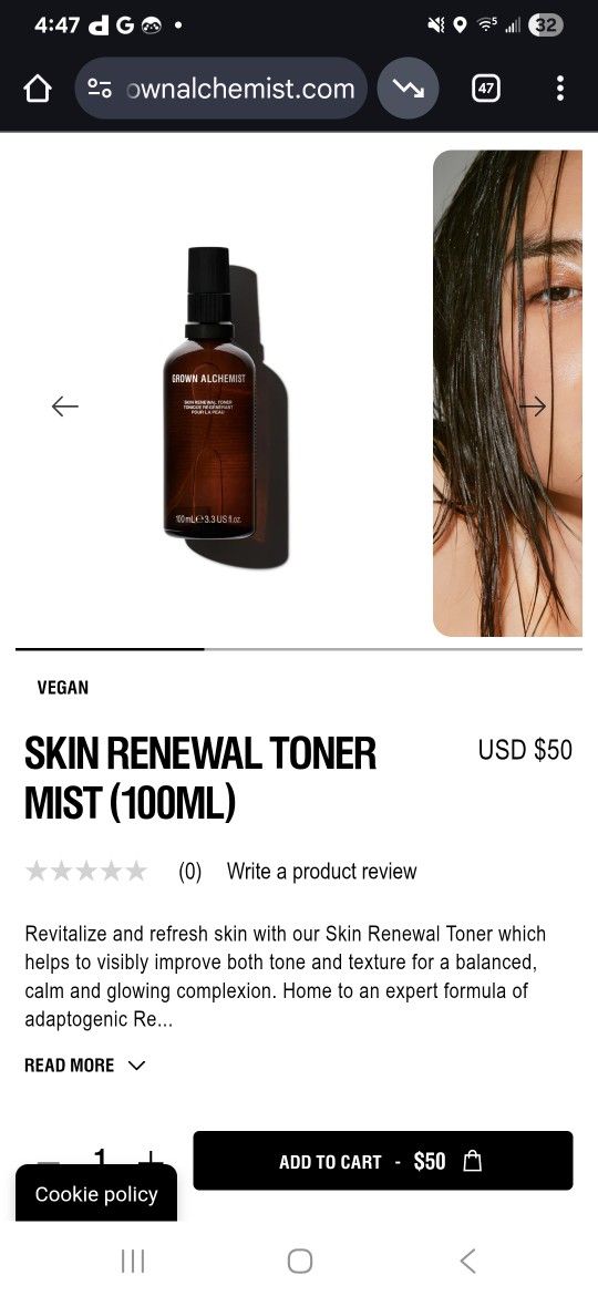 The NEW IN BOX GROWN ALCHEMIST Skin Renewal Toner Mist is a 3.3 fl oz fluid mist toner designed for all skin types. With main purposes of calming, toning, and balancing skin, it contains natural ingredients such as Echinacea, Ashwagandha, Reishi Mushroom, and Niacinamide (Vitamin B3). The product is free from mineral oil, parabens, and animal cruelty, making it suitable for vegan consumers. With a soothing scent of Geranium, Ylang Ylang, and Cedarwood, this toner from the ALCHEMIST Skin Renewal line by Grown Alchemist is a hydrating and oil-free solution for achieving a balanced and glowing complexion.