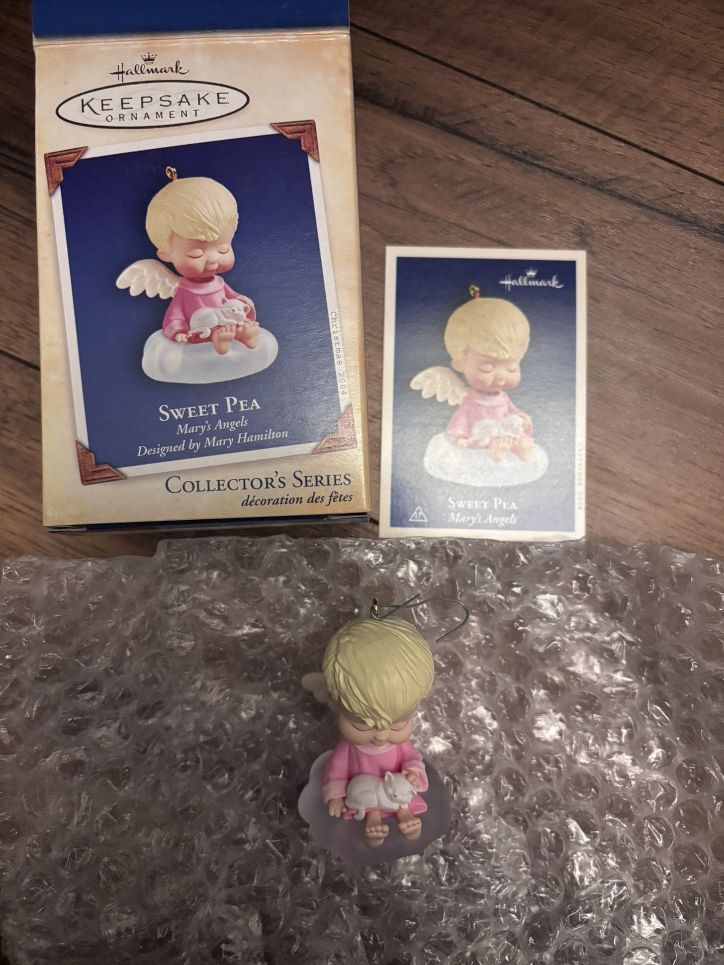This 2004 Mary's Angel ornament is a colorway (or repaint) of the 2004 Sweat Pea ornament. This ornament was given away as a Register-to-Win Prize at the 2004 Hallmark Ornament Premiere Event. Designed by Mary Hamilton.