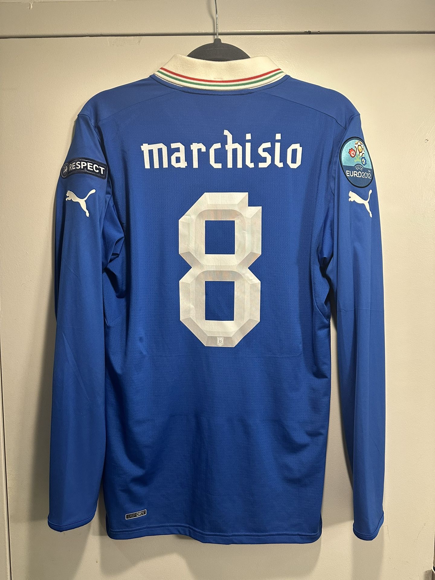 Long sleeve medium home jersey as worn by Marchisio when Italy finished 2nd in Euro 2012, losing to Spain in the final. Product code 740300.