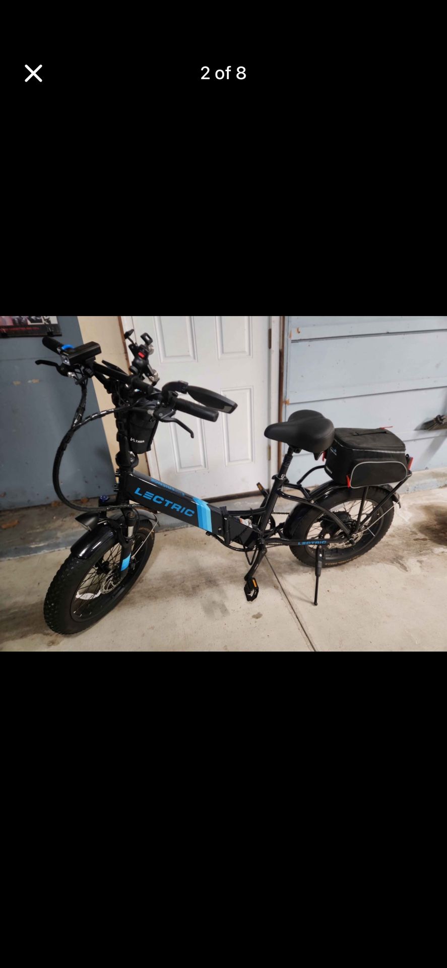 **Lectric foldable Ebike 2.0 Like new. Has only 20 miles! Used once or twice. Perfectlly clean and functional. Fully loaded with all accessories. Comes with charger, rear rack bag, riding gloves, repair tool kit, air pump, extra seat, extra baskets, mounting bar, phone holder, water bottle, and lights. 900 OBO