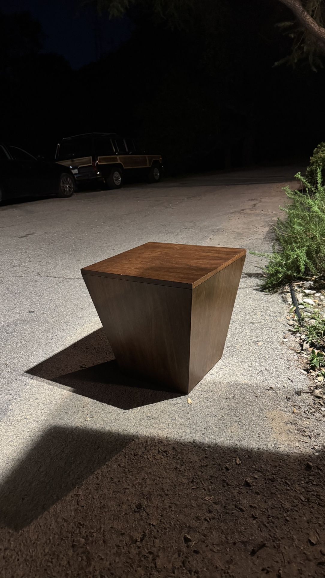 For pickup only. A sculptural modern wood storage cube with a tapered silhouette that is wider at the top and narrower at the base. It is crafted from warm toned wood with a smooth satin finish and clean minimalist lines. The interior is fully hollow which makes it useful for storing blankets, books, vinyl, or other household items. At roughly knee height it can also work as a small side table, plant stand, or simple accent stool. The geometric shape gives it a contemporary architectural look that fits well with modern Scandinavian or mid century inspired interiors. 19” W 19”L 19” H