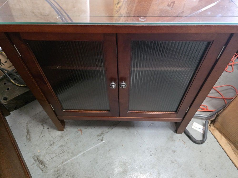 Two solid wood end tables with wood and glass doors with glass top covering. Has normal light scratch here and there but not bad No damage other than that to mention They measure 34" wide 20 1/2" deep 30 1/2 tall Very strong set
