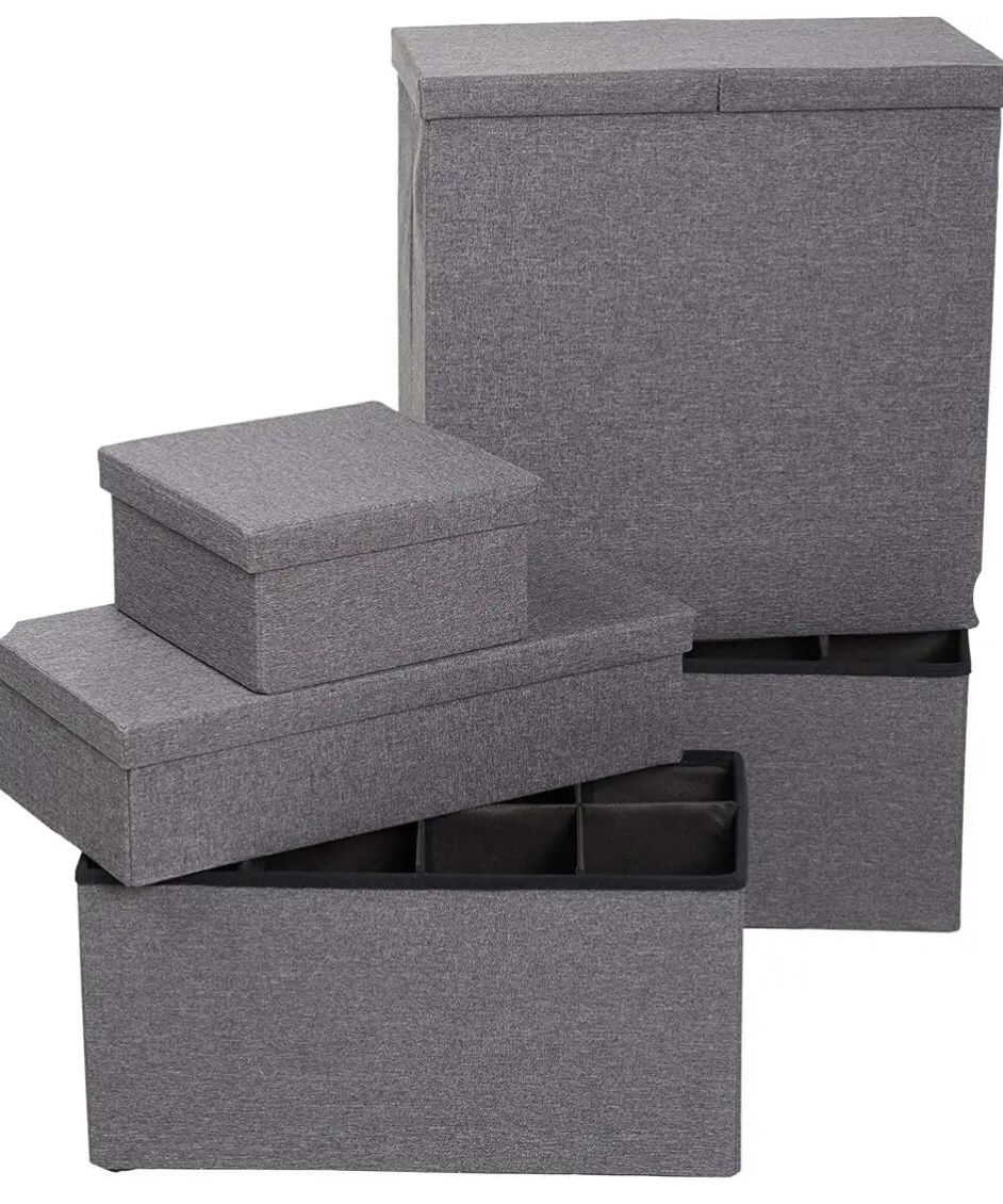 Get Organized for the New Year A very nice quality collapsible 5 piece organizational storage system. Great for closet or under the the bed storage/organization. Buy by the piece or all 5 pieces 1-Small box with lid (12in X 12in X6in) $5.00 1-Large box with lid (24in X 12in X 6in) $7.50 2-Large boxes w/ divider (12in X 12in X 24in ) $10.00 ea 1-Ex Large box/ hamper with lid (12 in X12inX 24 in) $20.00 OR All 5 boxes for only $40.00 dollars