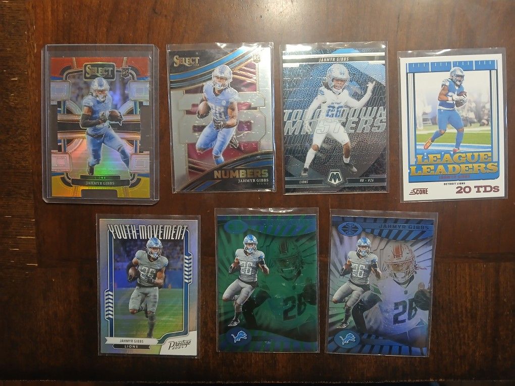 I have this 7 jahmyr gibbs rc 2nd yr & 3third yr cards for sale im not looking I want $5.70 for all 7 offers will be ignored 1 rc red yellow silver die cut base 1 rc numbers insert 1 touchdown masters big head insert fresh pull 1 red foil insert 3th yr 1 holo insert 2nd yr 1 green parallel base 2nd yr 1 holo base 2nd yr