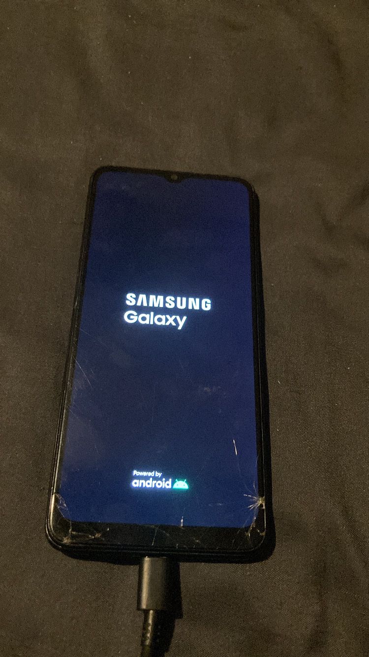 Samsung Galaxy A03s device for sale. The screen exhibits cracks in the lower right quadrant and the rear casing displays signs of wear and scratching. The device charges normally and functions without issue. Open to reasonable offers.