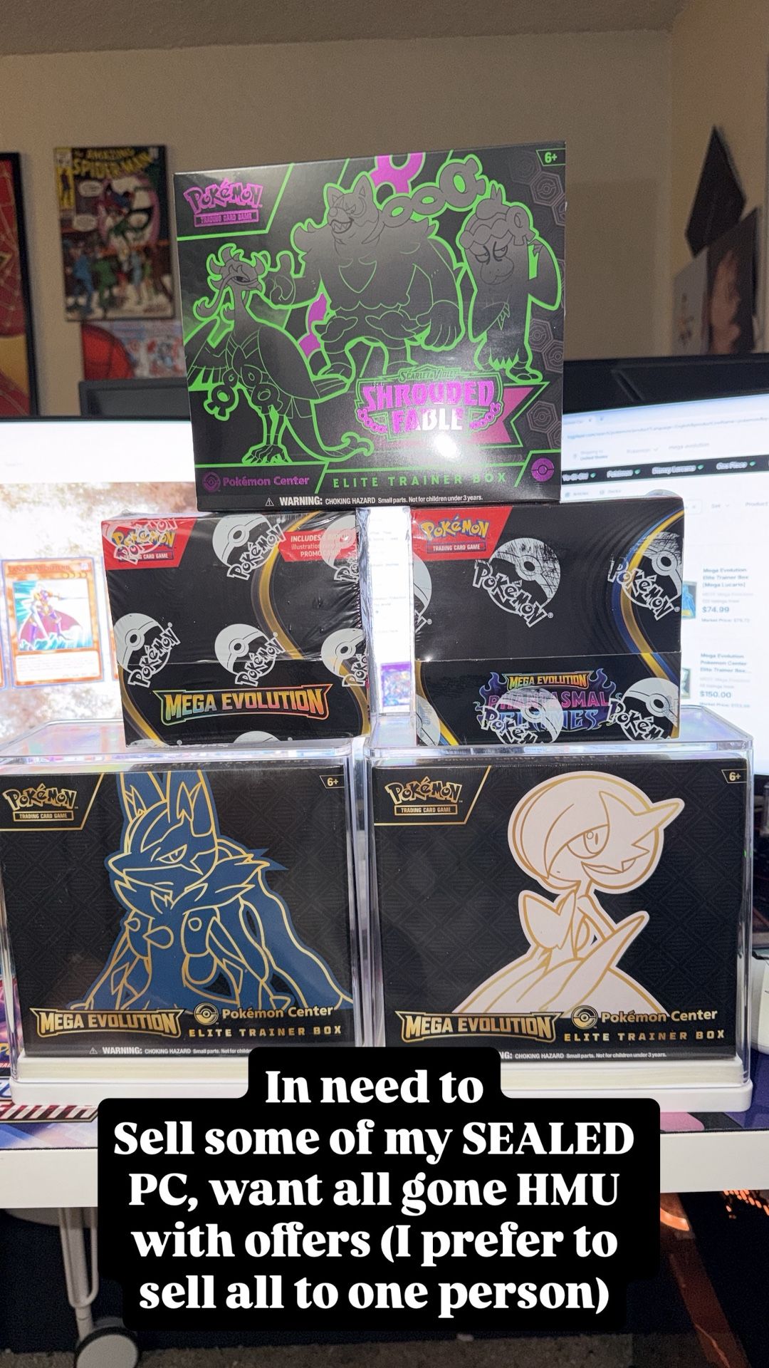 Need to sell for personal reason, unfortunately I have to let go some of my sealed collection. Wanting to sell all to one person but will negotiate if sold separately Phantasmal Flames BB- $295 Mega Evolution BB- $250 Mega Gardevoir ETB- $155 Mega Lucario ETB- $-180 Shrouded Fable ETB- $125