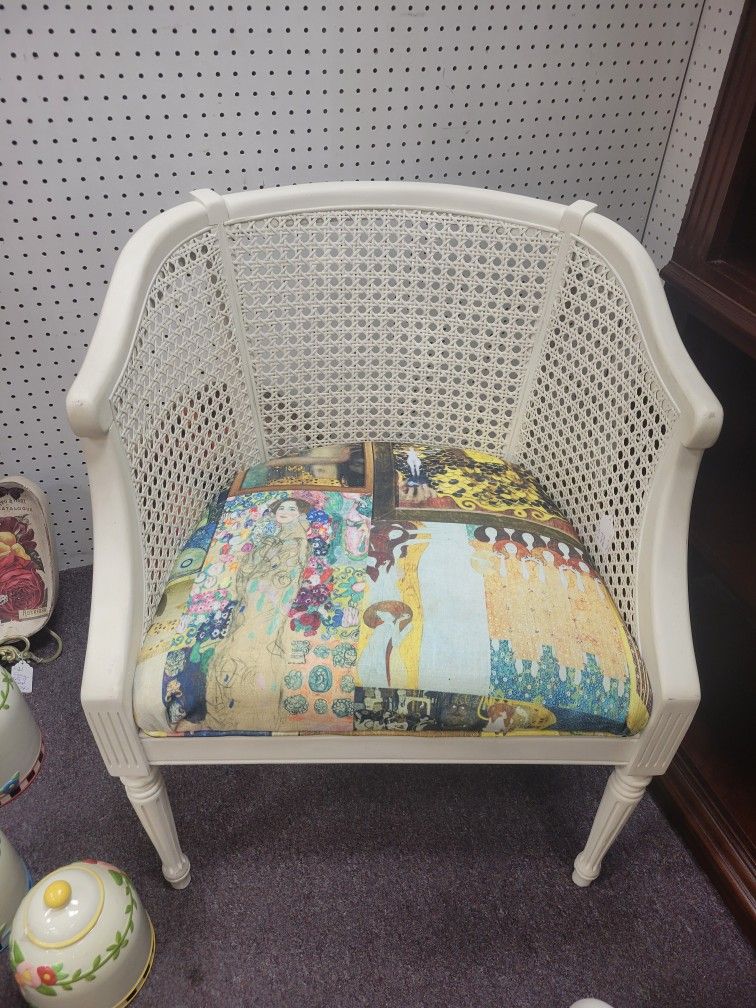 Comfortable barrel chair, painted white with pretty upholstered seat. Booth #21 has liquidated.. was $100 now $40 La Mesa Antique Mall 4710 Palm Ave La Mesa 91941 Open 10 am to 5 pm Free Parking in our lot while shopping with us