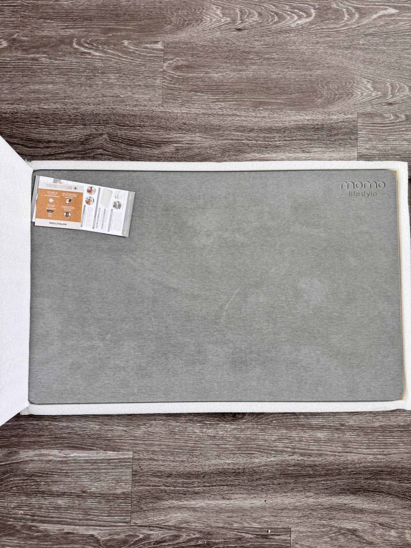 Brand new in box, never used. This is the GRANDE size super absorbent, fast-drying stone bath mat from Momo Lifestyle. Perfect for keeping your bathroom floor dry and clean. Sleek grey color with minimalist design. Retails for 120$.