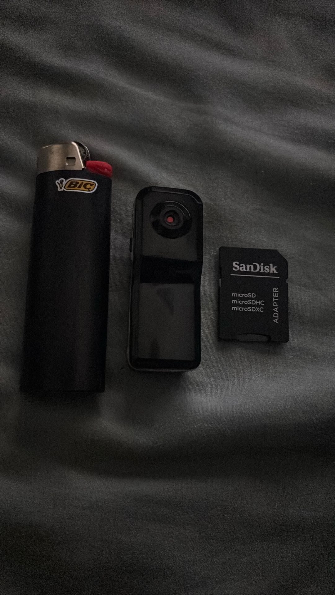 Mini video camera (lighter for size reference) comes with a micro sd to sd card adapter asking $3 no charger