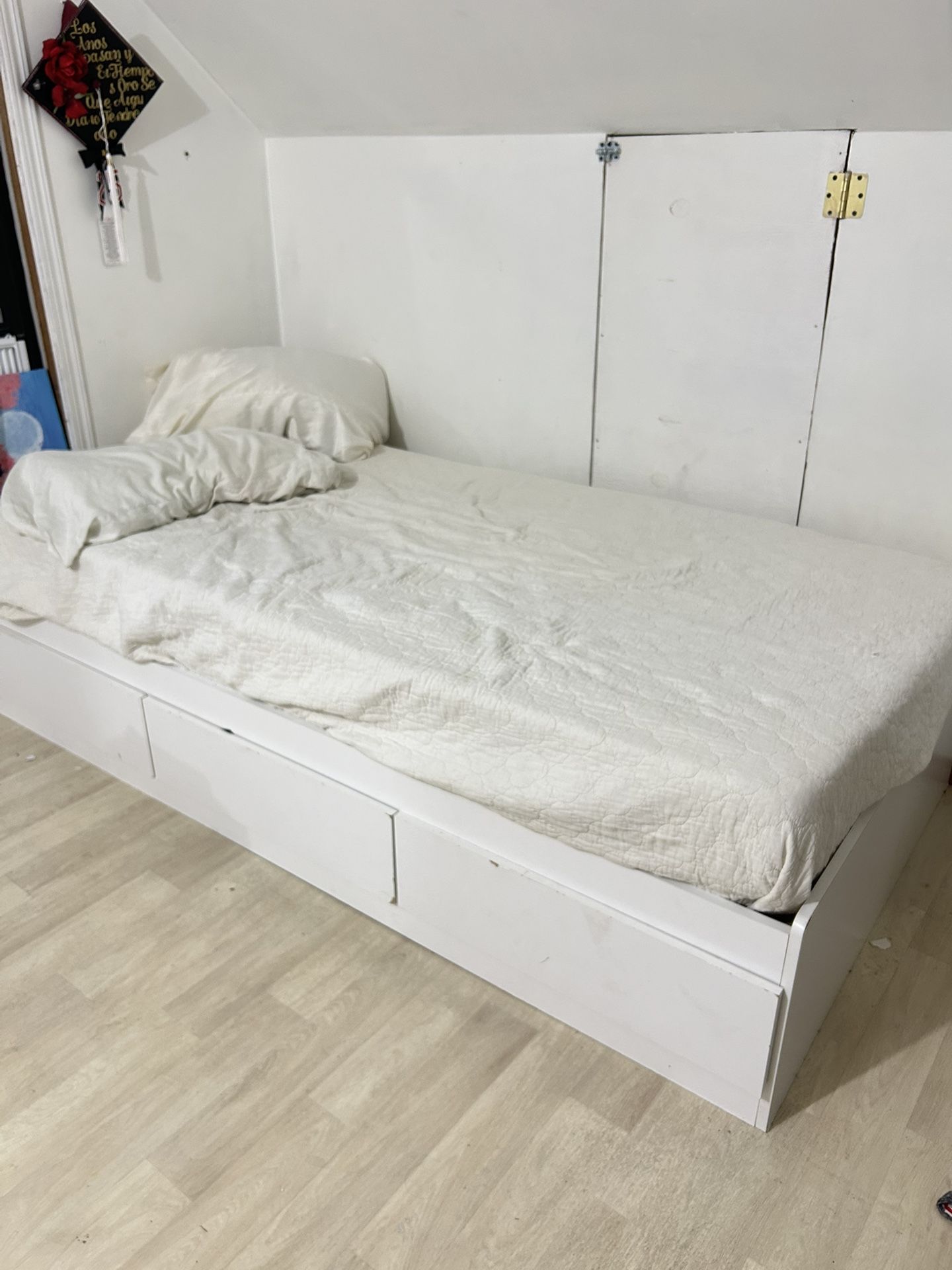 Wood twin bed frame 3 drawers built in has small scuffs around it