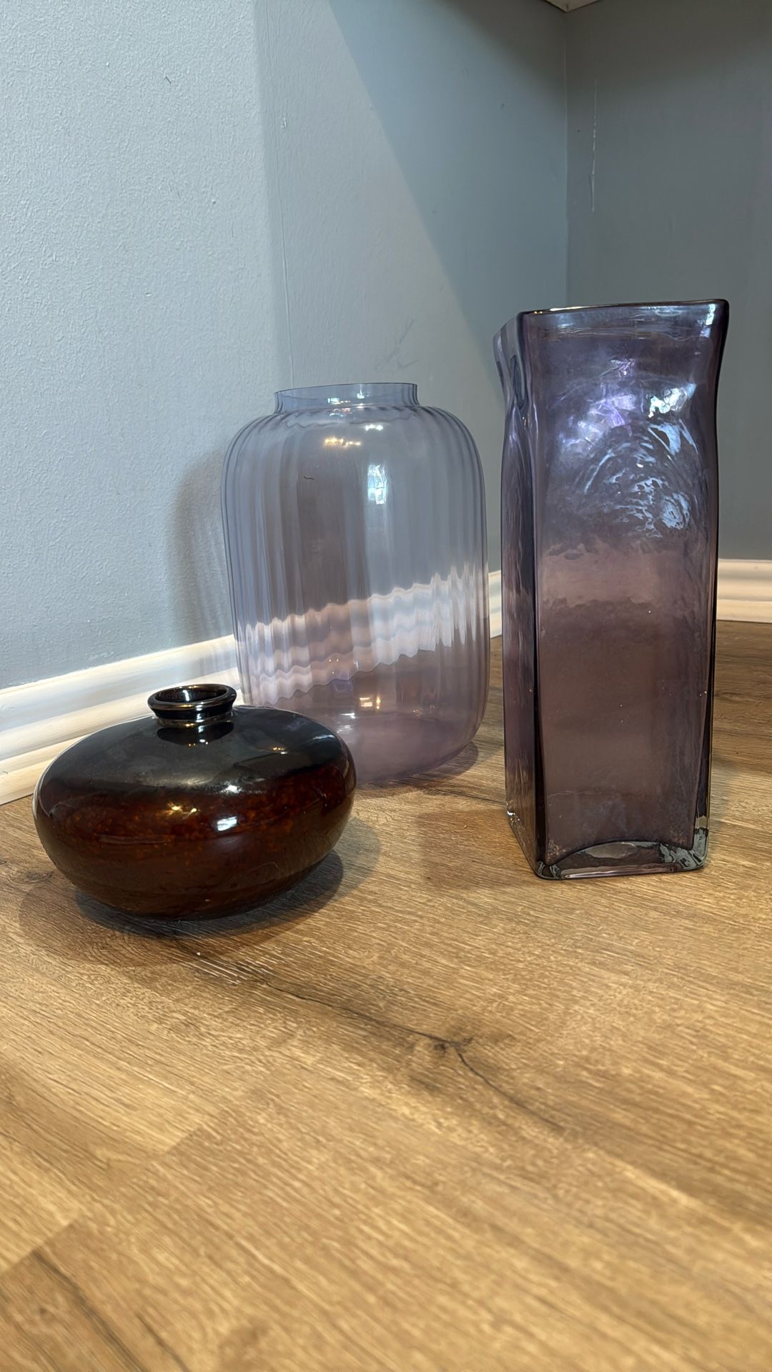 Pale Lavender and darker purple on the tall ones; caramel and amber notes with iridescent navy tones on the little vintagey piece (mid century vibes on that one)